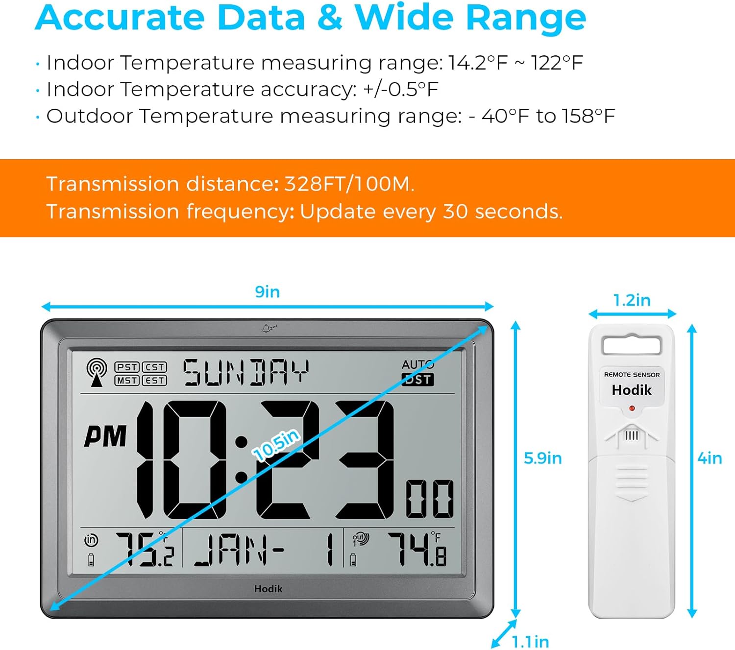 - [ Atomic Clock Indoor Outdoor Temperature ] Digital wall clock with 10.5 inch (9*5.9*1.1 in) extra large LCD display. Wide use for Elderly, Seniors, Adults, Youth, Children, Teens for Bathroom, Livingroom, Bedroom, Office.
