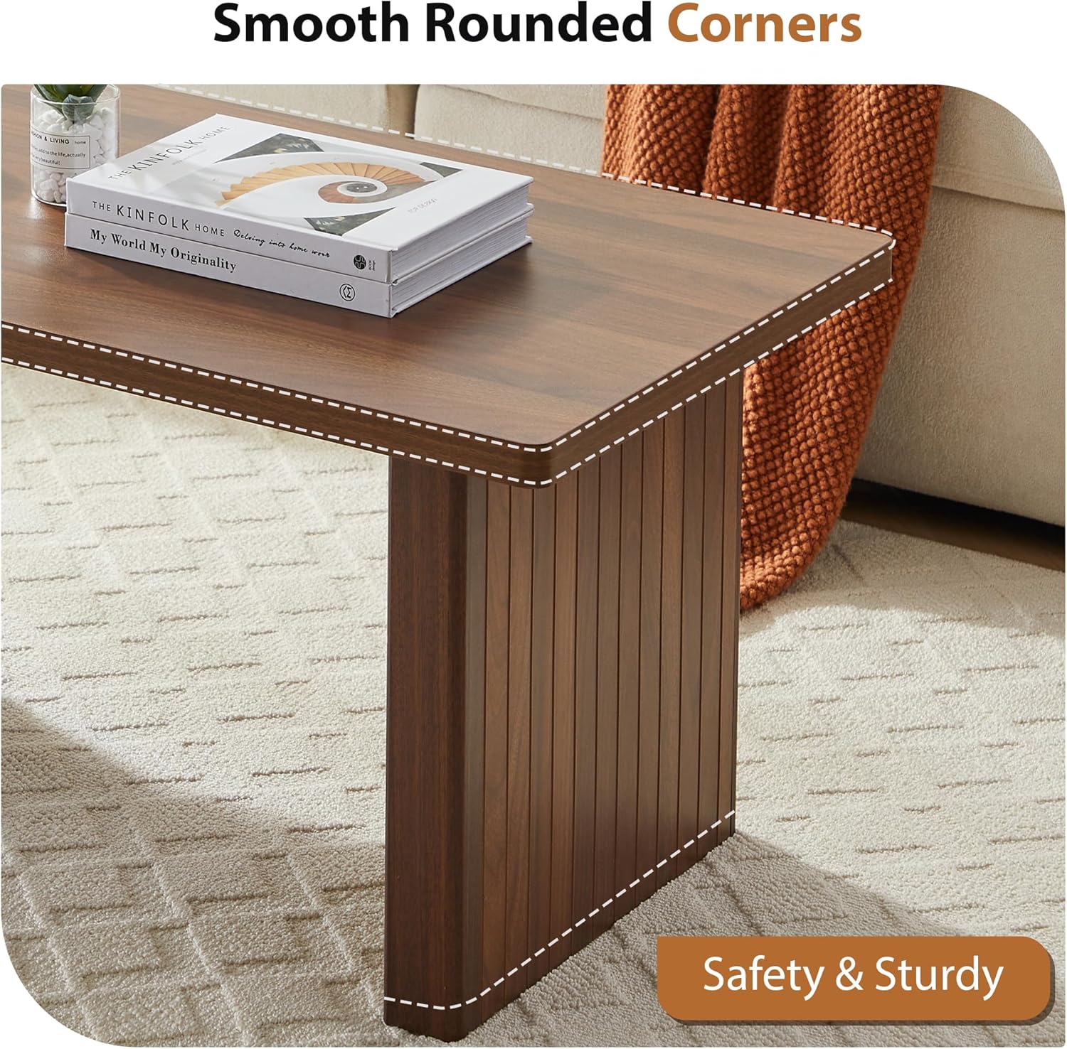 Rectangular Fluted Coffee Table, Farmhouse Wood Coffee Table Mid Century Modern Center Table Boho Living Room Tables for Living Room Office (Walnut, 19.69" D x 43.3" W x 17.72" H)