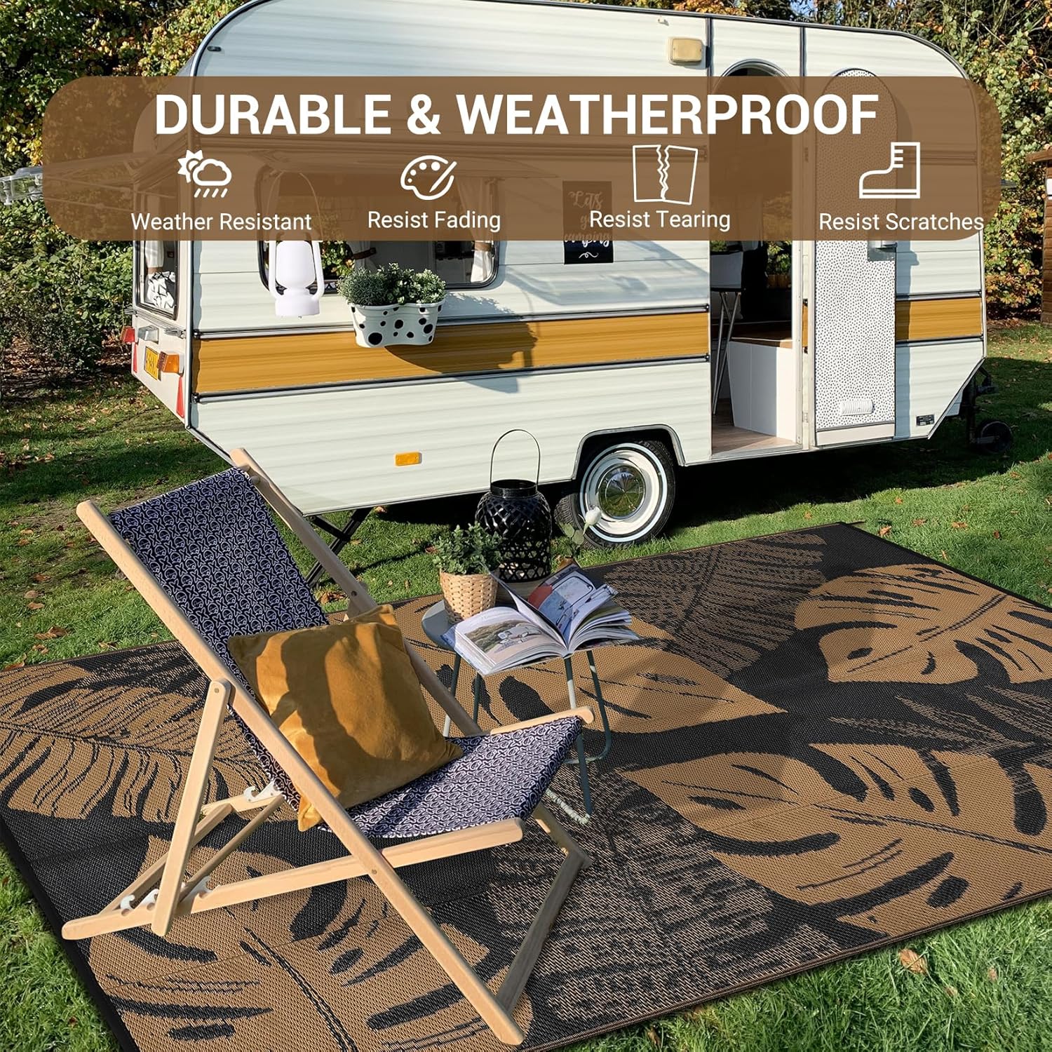 GAOMON Outdoor Patio Rug 9x18 Waterproof Outdoor Plastic Straw Rug Reversible Camping Mat, Foldable Portable RV Picnic Carpet with Bag & 4 Stakes, UV Resistant Outside Carpet for Deck Balcony, Brown