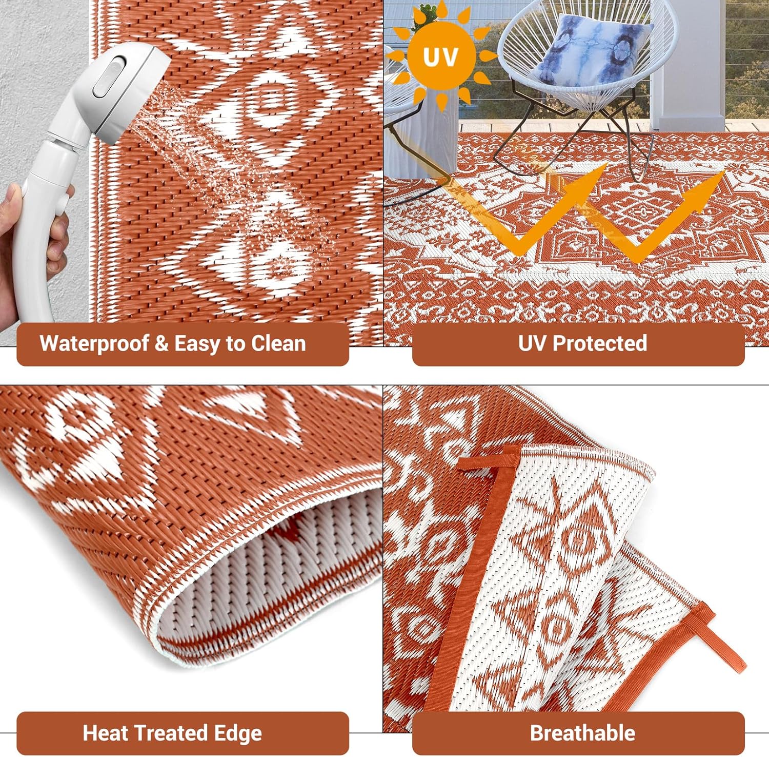 - Durable & Comfortable: Made from premium recycled plastic straws, the outdoor mat is waterproof, UV-resistant, and fade-resistant. Heat-treated, anti-fray stitched edges ensure long-lasting use, while the soft surface feels great under bare feet