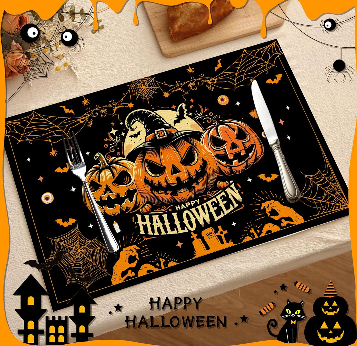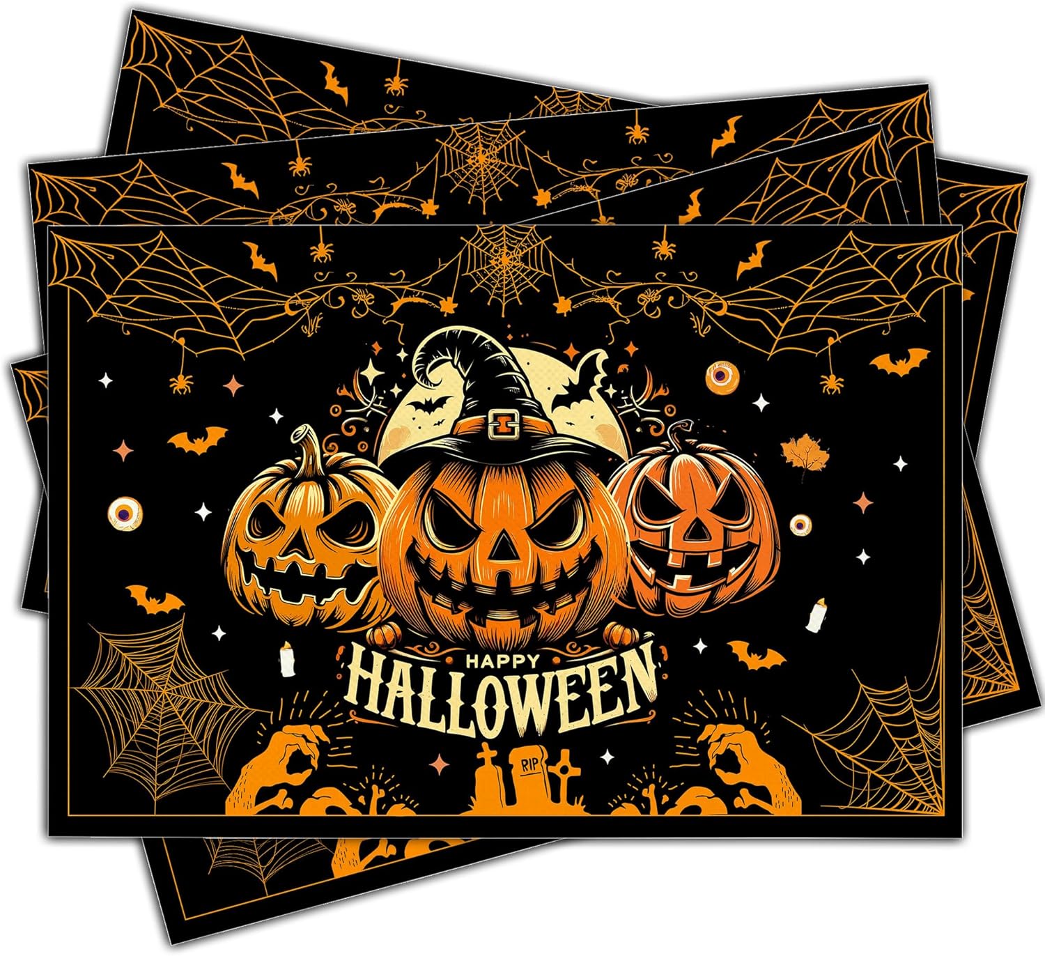 Halloween Spooky Placemats Set of 4, 12x18 Inch Pumpkin Bat Table Mats, Washable Heat Resistant Place Mats for Kitchen Dining Table, Halloween Themed Decoration for Home-B05