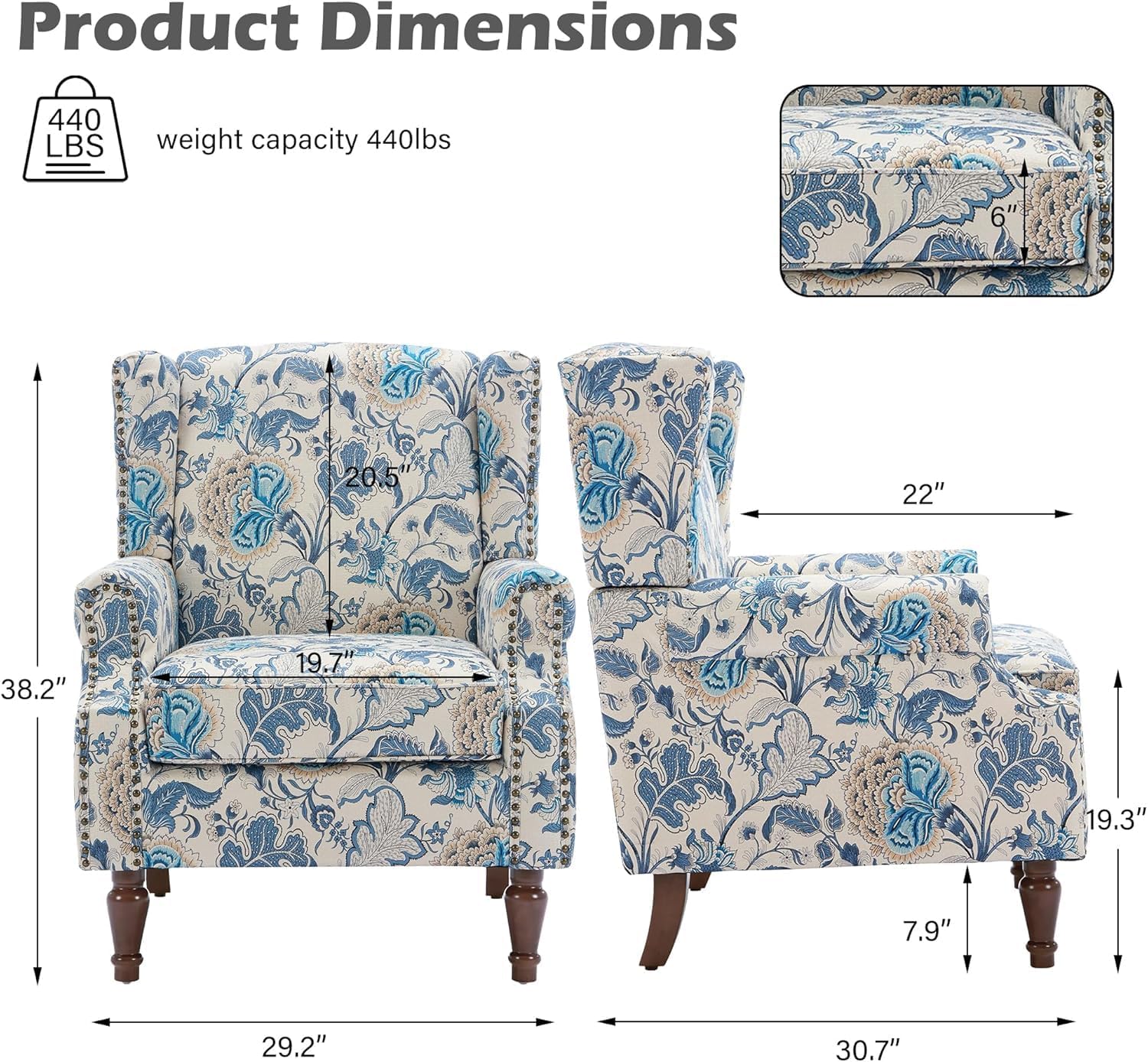 UIXE High Back Floral Accent Chair, Fabric Upholstered Armchair for Living Room, Retro Printed Wingback Arm Chair Nailhead Trim Single Sofa Bedroom Reading Seat - Boho Blue