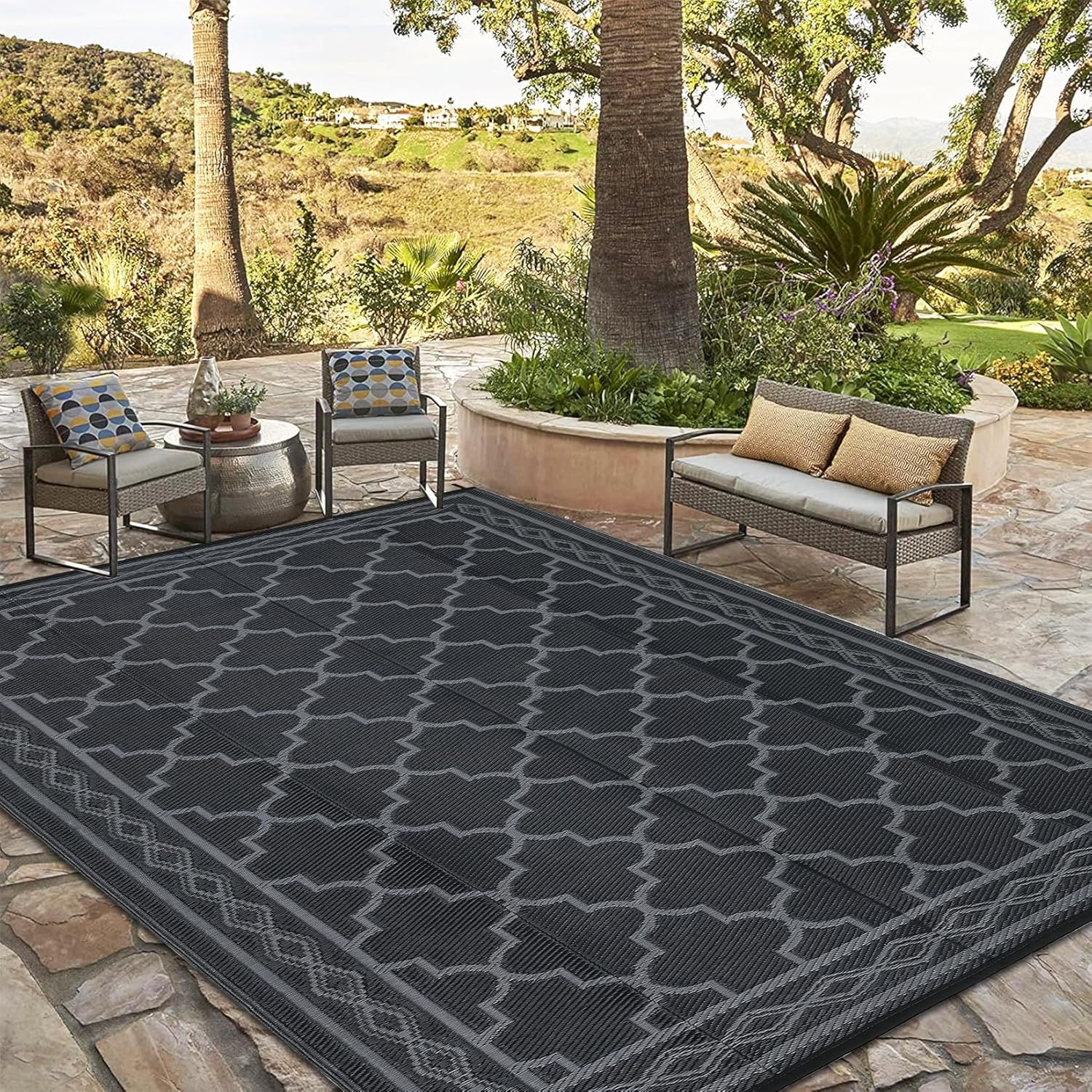 GAOMON Outdoor Rug 9'x12' Waterproof Rug for Patio Decor, Foldable Reversible Plastic Straw Area Rugs Mat for Camper, Outside Carpet for Deck, Porch, Picnic, Beach, Black/Grey(Geometric)