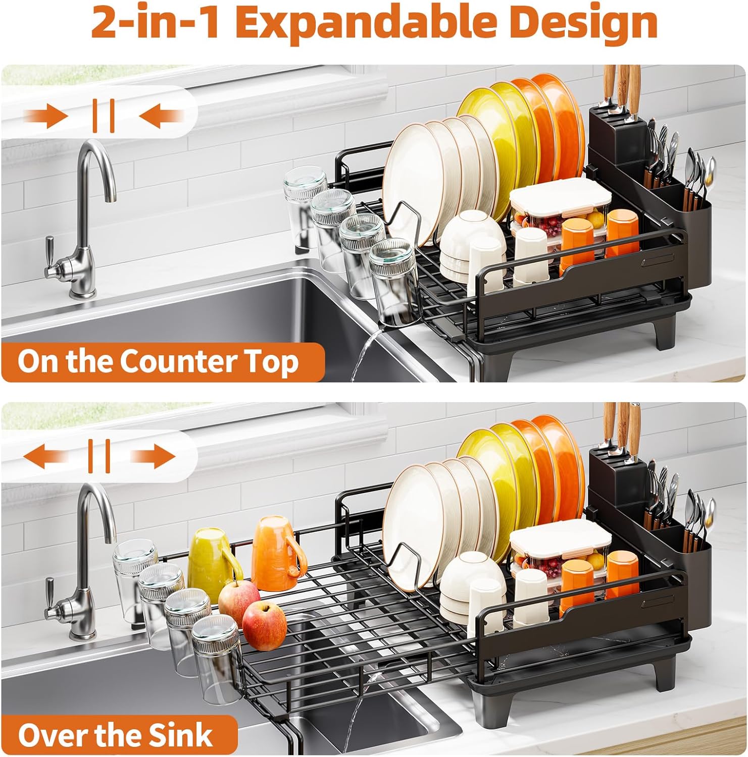 - Large Capacity: This expandable dish drying rack measures 12.3"–21.5" long, 15" wide, and 7.9" high, offering up to 50% more space. It holds 8 plates, 12 bowls, 8 cups, plus lunch boxes and more, making it the perfect dish rack for families and home cooks