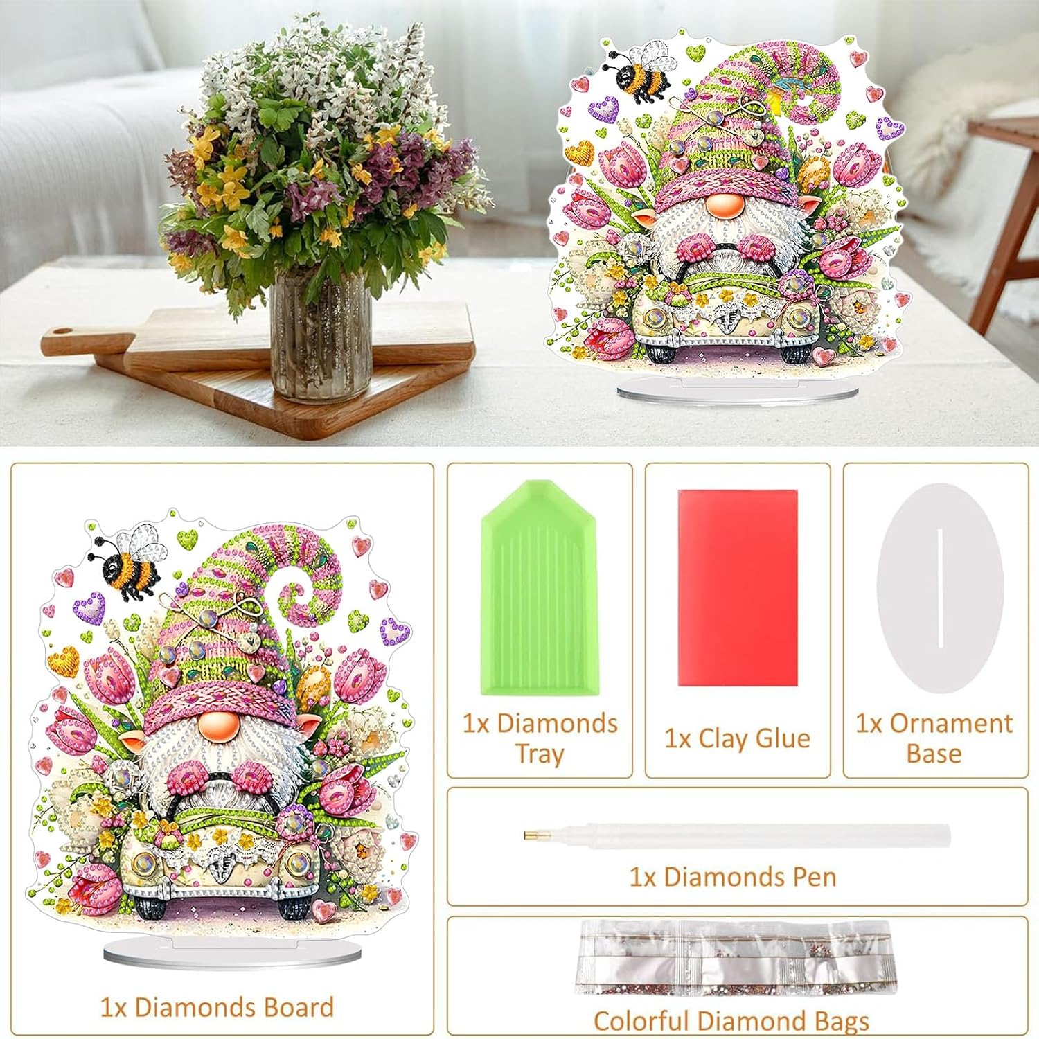 - 【DIY Diamond Desktop Ornament】:Package of the ornament includes:1 X desktop ornament, 1 X diamond dainting tool kit (Colorful Diamond Bag, Clay Glue, Pen and Diamond Tray).