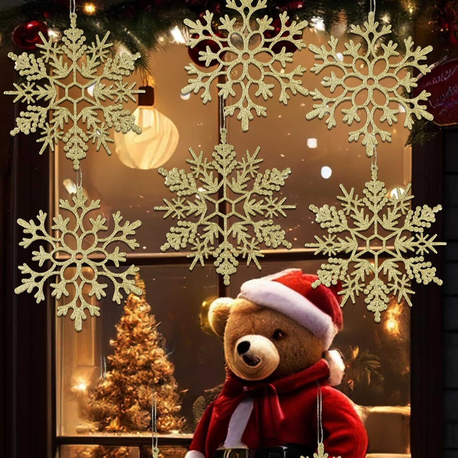 - Premium Snowflakes: These stunning gold snowflakes are crafted from high-quality plastic with a dazzling shimmer. Their durable design allows for years of reuse while maintaining perfect shape. The glitter is securely adhered and resists flaking, making them an ideal choice for Christmas tree decorations