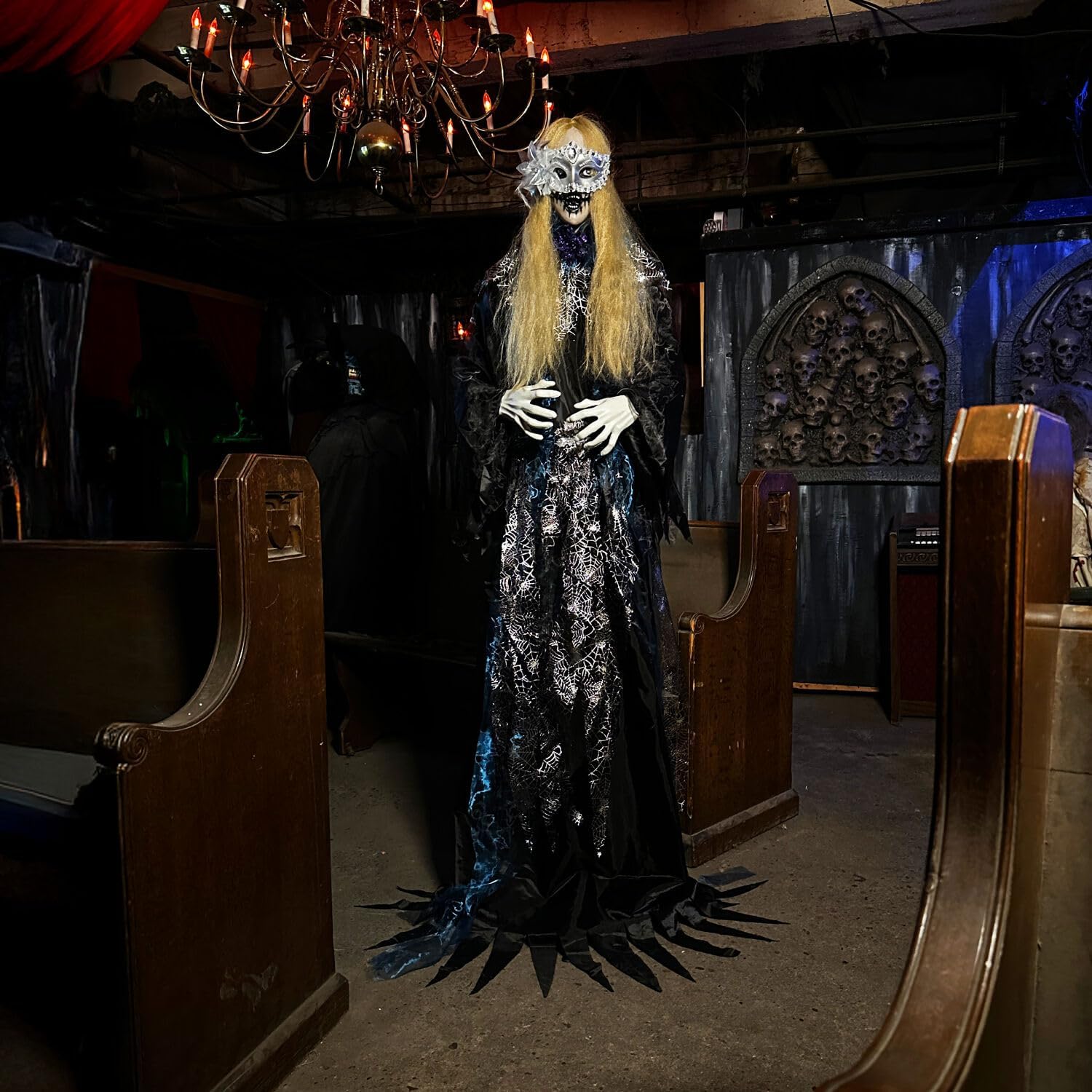 Haunted Hill Farm 5.5-Ft Animatronic Animated Standing Masquerade Lady, Halloween Animatronic, Spooky Venetian Masquerade Prop, Creepy House Party Decoration, Touch-Activated Lights & Sound, Life-Size