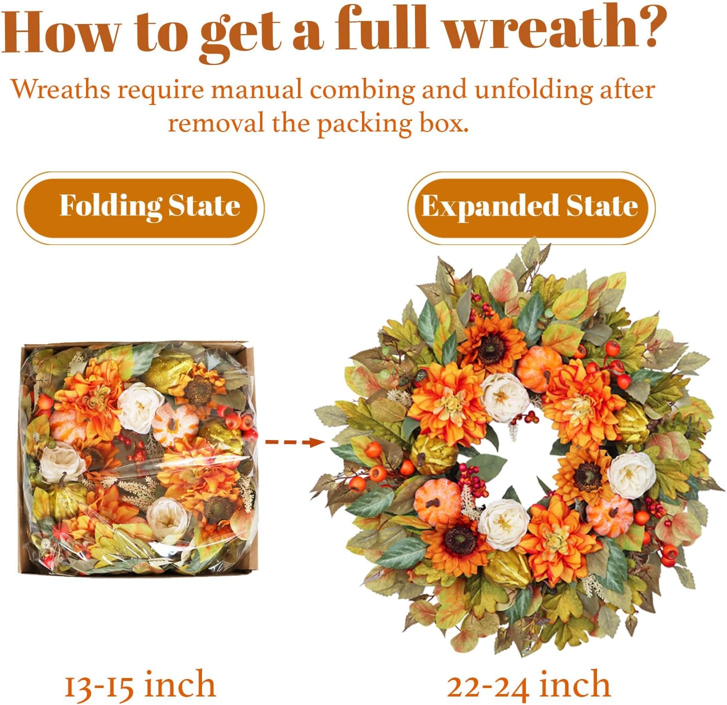 - đžăDurable Craftsmanship with Realistic TextureăHandcrafted with premium silk flowers and textured artificial foliage, every flower, fruit, and leafâwhether dahlia, pumpkin, eucalyptus, or oakâis securely attached to prevent falling or fraying. Built to withstand seasonal use both indoors and under covered outdoor areas, this wreath keeps its vibrant color year after year.