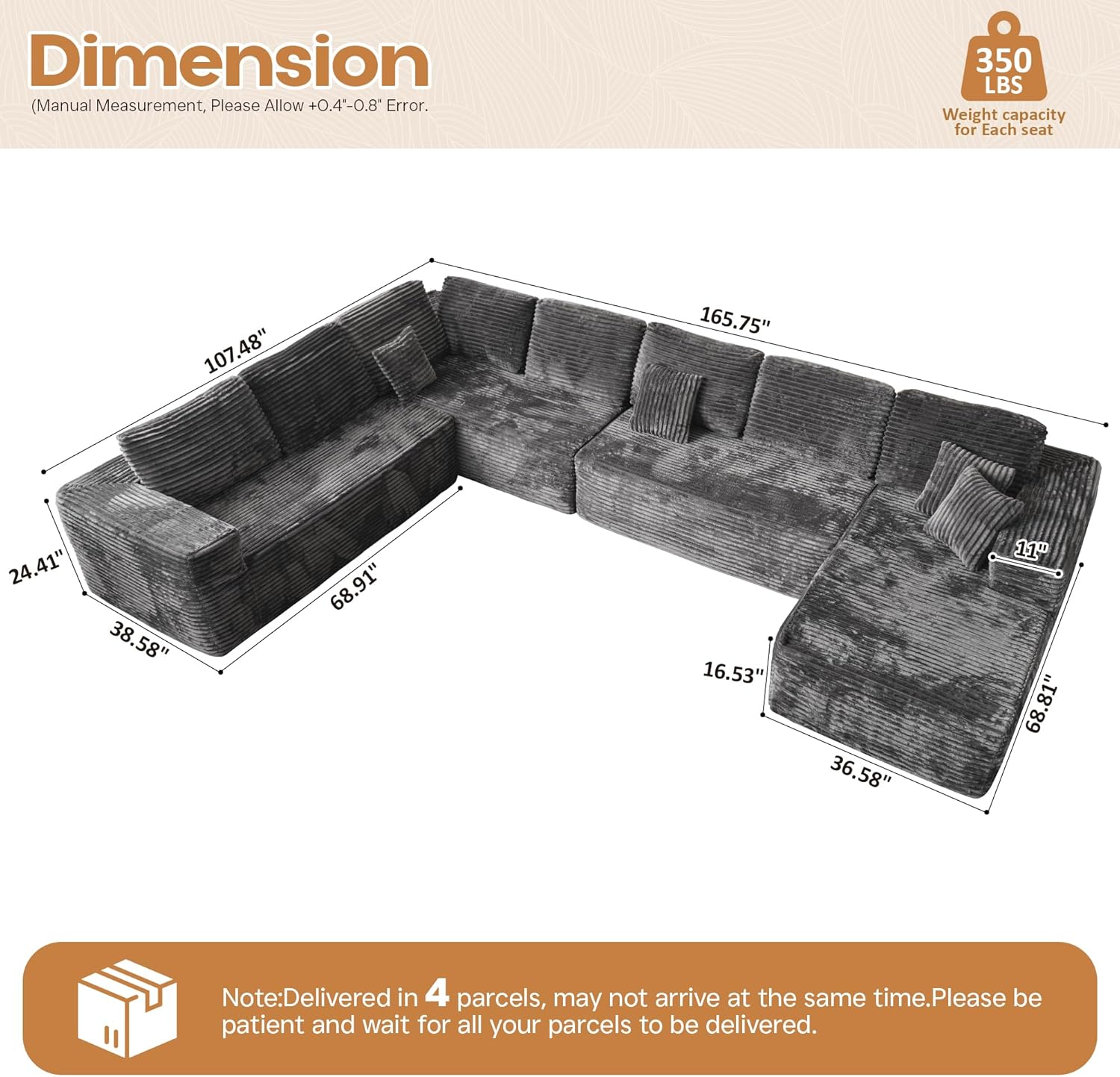 - Product Dimensions : 107"D x 165"W x 24.41"H