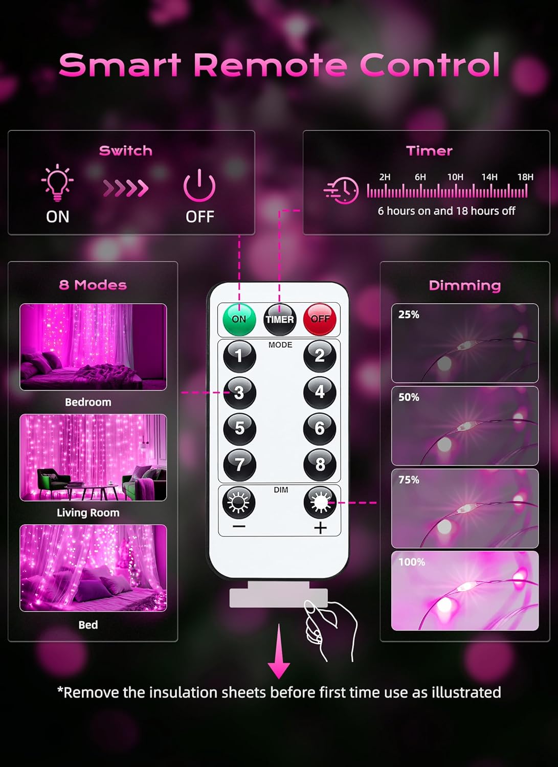 - [Timer & Remote] We can use the remote control to timing for 6 hours on and 18 hours off. What's more, the brightness of our curtain lights is adjustable of 20% 40% 60% 80% 100%