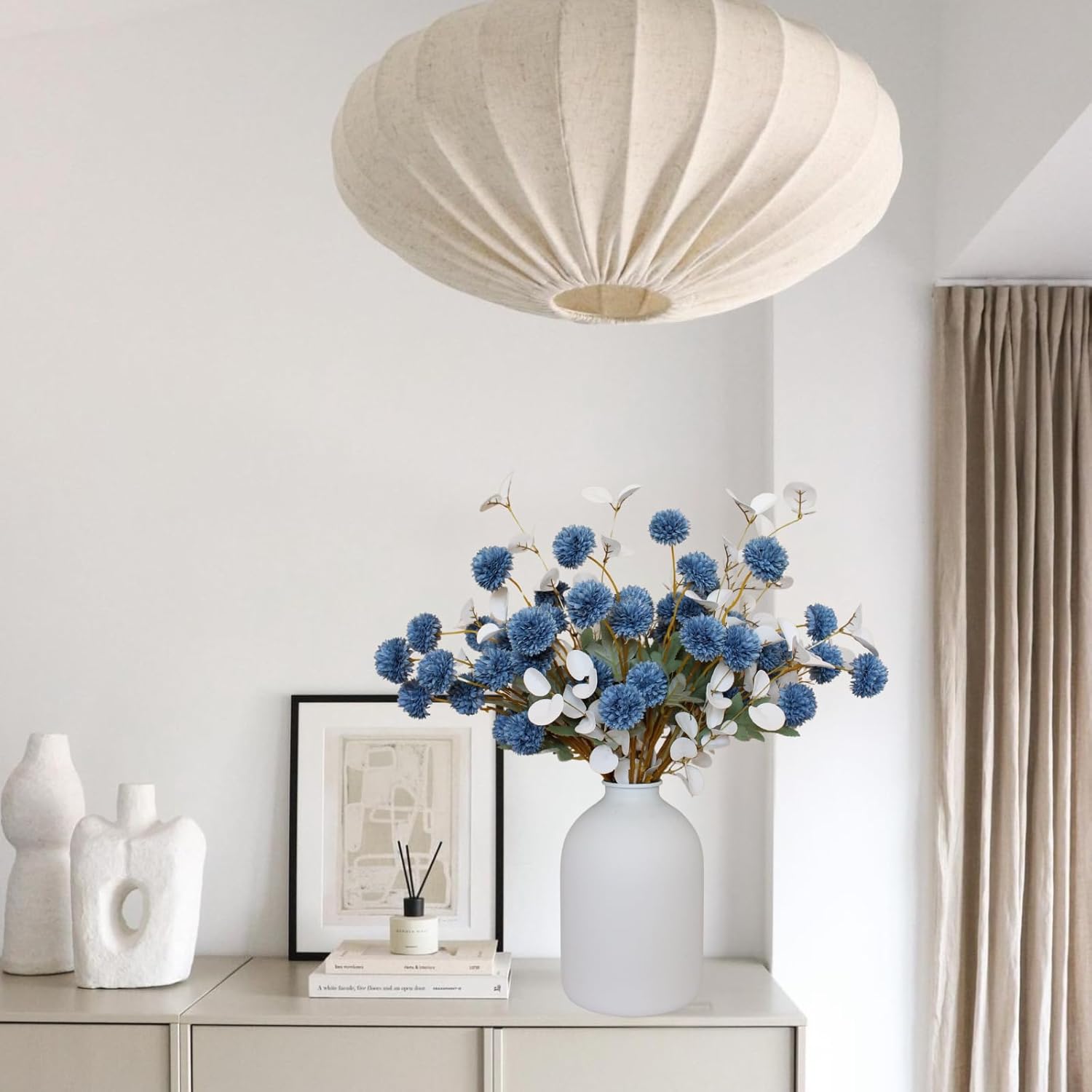 - Blue Artificial Flowers - This set of faux dusty blue flowers which features 2 branches white eucalyptus stems and 10 blue fake mums artificial flowers, creates stunning blue centerpieces for tables. With long stems for vases and perfect for silk flower arrangements, itâs ideal for floral wedding decorations or blue floral decor in living rooms, dining areas, or kitchen.
