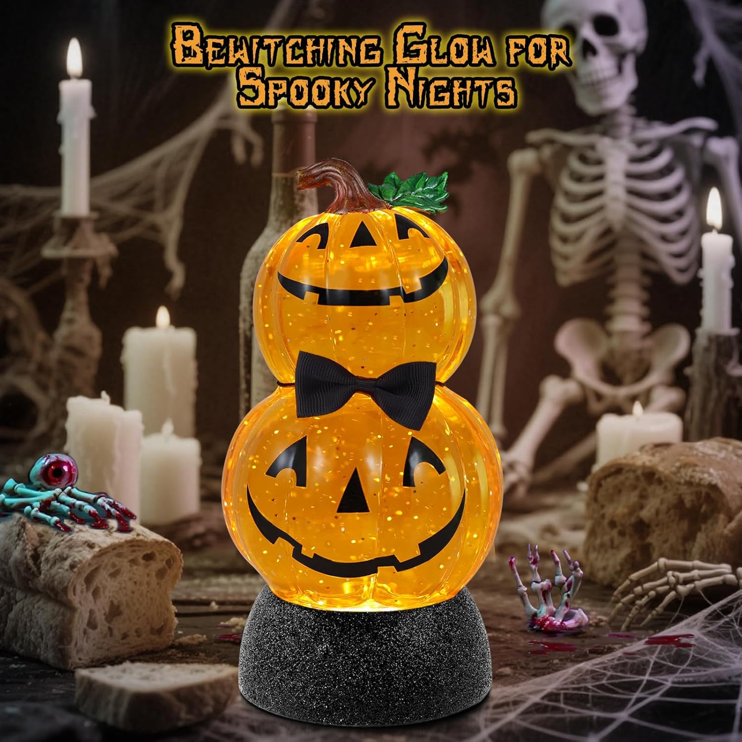 - Ultimate Halloween Atmosphere Creator: Transform any space into a haunted wonderland with our pumpkin snow globe glitter! Packed with eerie Halloween charm, Halloween table decorations features swirling glitter, ghostly music, and a black base. Perfect for fireplace mantels, tabletops, porches, or Halloween parties. Whether for haunted houses, costume parties, or trick-or-treat displays, Halloween decorations indoor keeps the Halloween spirit alive with its glowing light and haunting sounds.