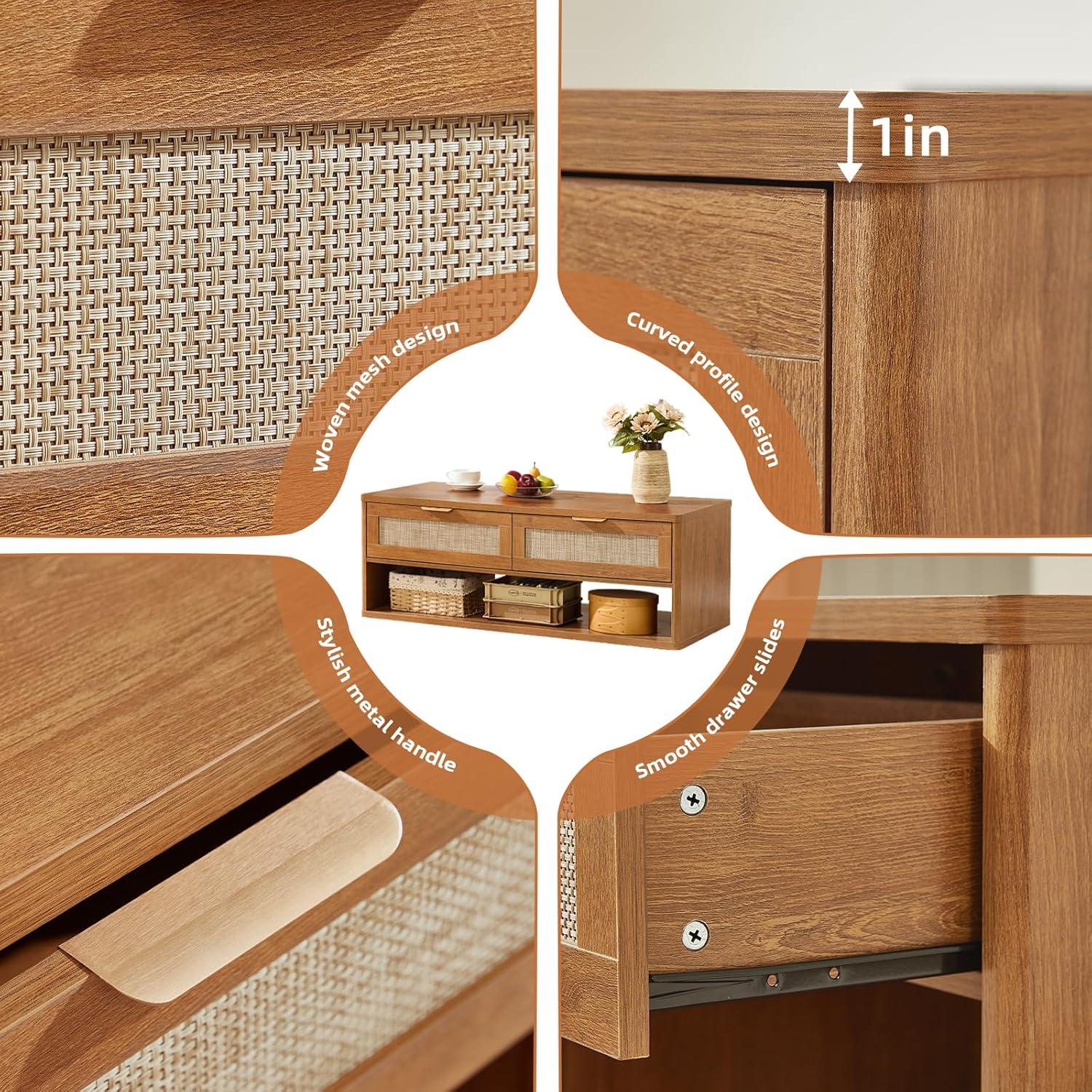 - Bohemian Rattan Coffee Table:Designed to complement the LEYAOYAO furniture collection, this bohemian-style center table for living rooms features an aged wood-grain finish and woven rattan panels. High-quality metal knobs and drawer runners contribute a modern or farmhouse aesthetic.