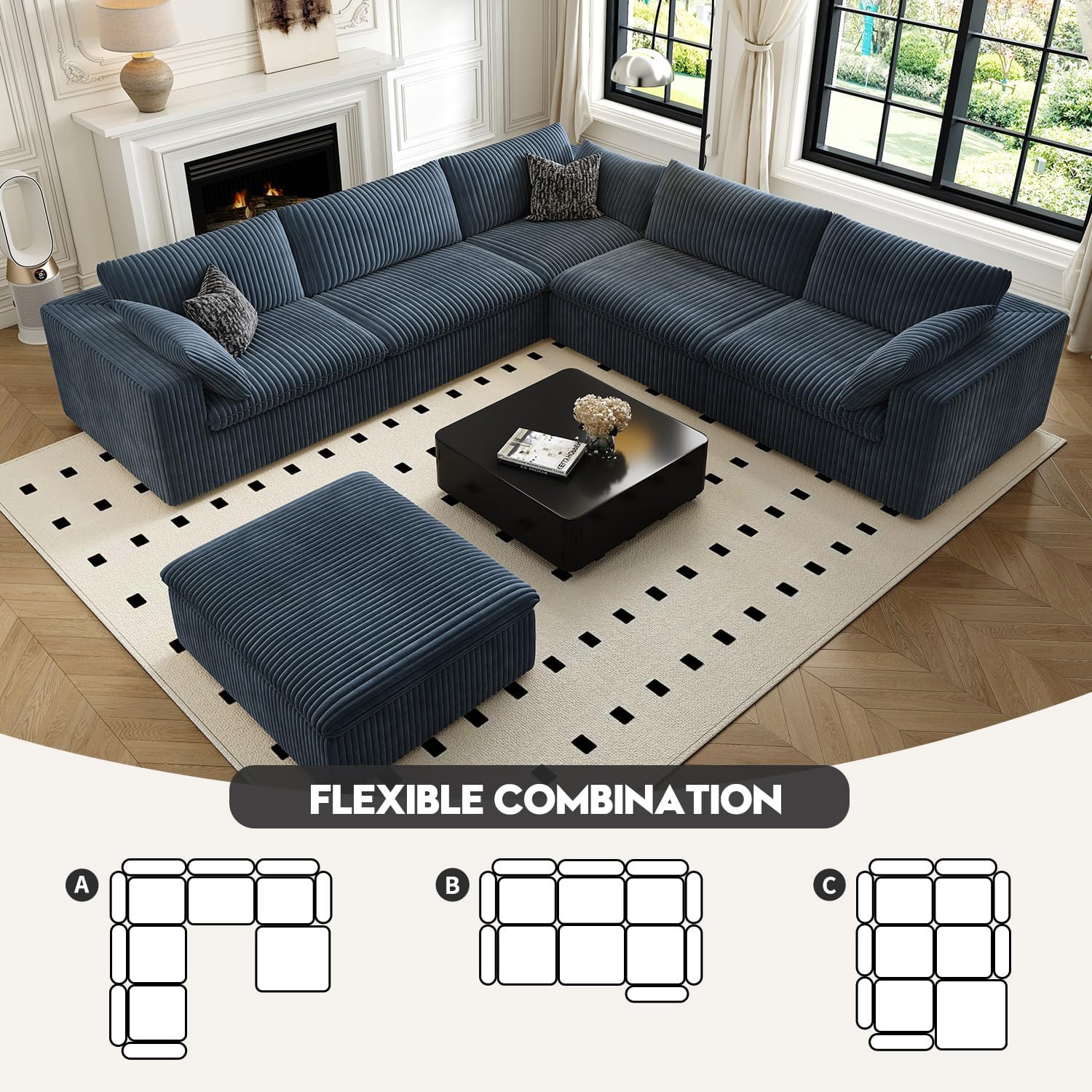 118" Cloud Couch Oversized Modular Sectional Sofa for Living Room,Modern Sofa with Deep Seat,6 Seater Boneless Couch,Comfy Upholstered Corduroy Couches for Apartment, Studio, Office,Bedroom,Blue