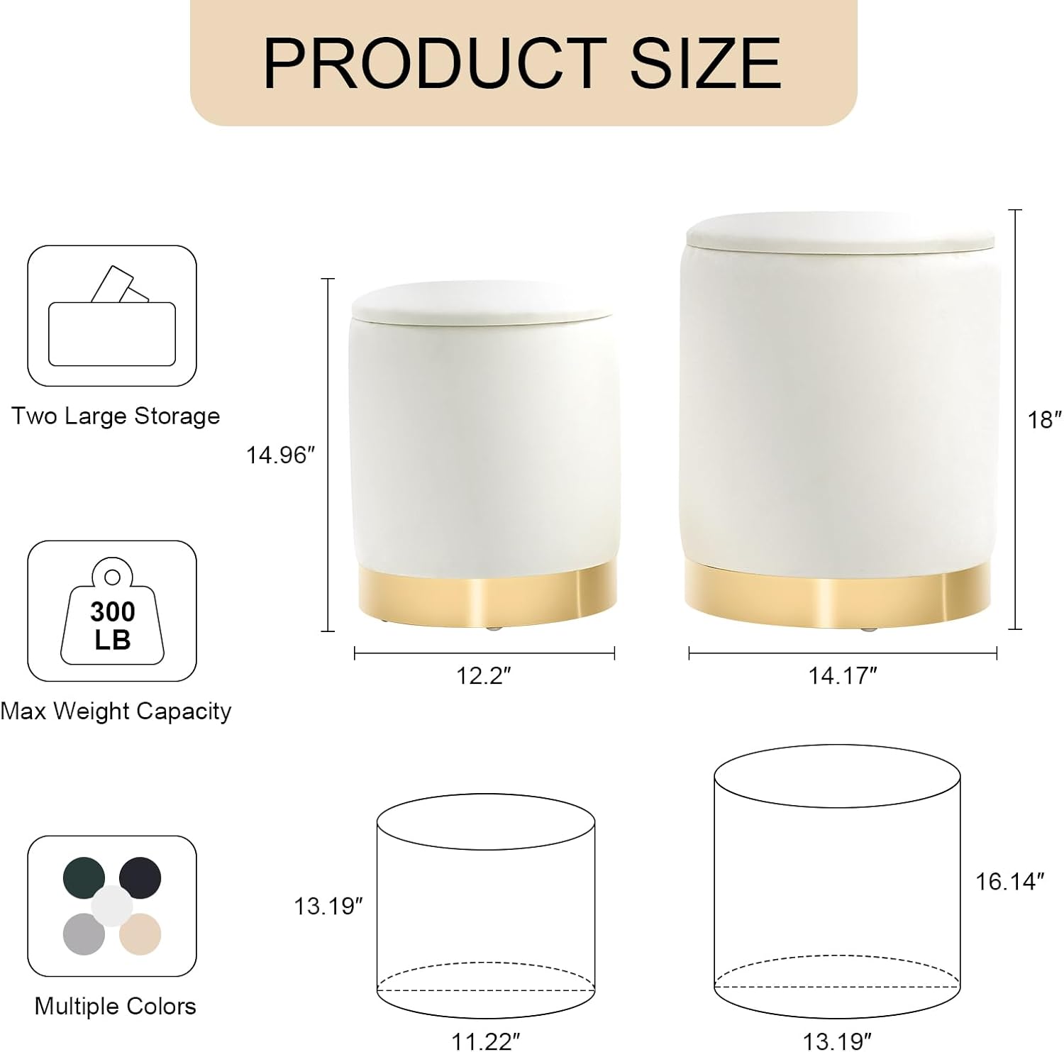 Round Ottoman with Storage Set of 2, Upholstered Velvet Storage Ottomans, Vanity Stool, Multifunctional Ottomans, Coffee Table Foot Rest Ottoman for Living Room Bedroom, White