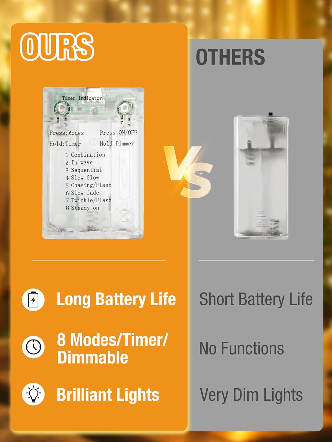 - 8 Modes and Dimmable Fairy Lights : Fairy lights battery operated is equipped with a dual-button switchāthe left button switches between 8 lighting modes (combination/wave/sequential, etc.) The right button turns the string lights on or off with a single click, and a long press allows for seamless brightness adjustment to suit your mood and needs. Fairy lights have a memory function, eliminating the need for repeated settings and saving time and effort