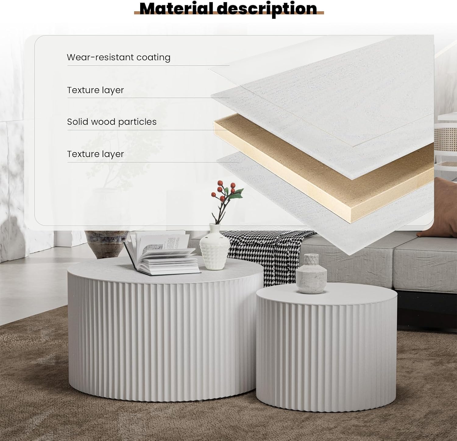 Round Nesting Coffee Table Set of 2 Handcraft Circle Fluted Nesting Coffee Tables Circular Side Table Drum Accent End Tables for Living Room Bedroom (White A Small)