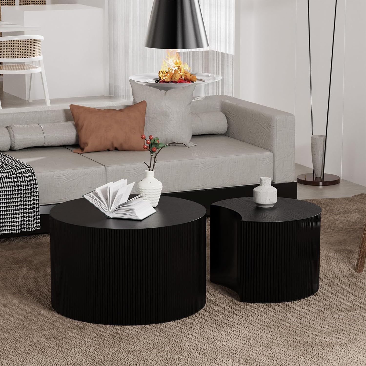 Round Nesting Coffee Table Set of 2 Handcraft Circle Fluted Nesting Coffee Tables Circular Side Table Drum Accent End Tables for Living Room Bedroom (Black Large)