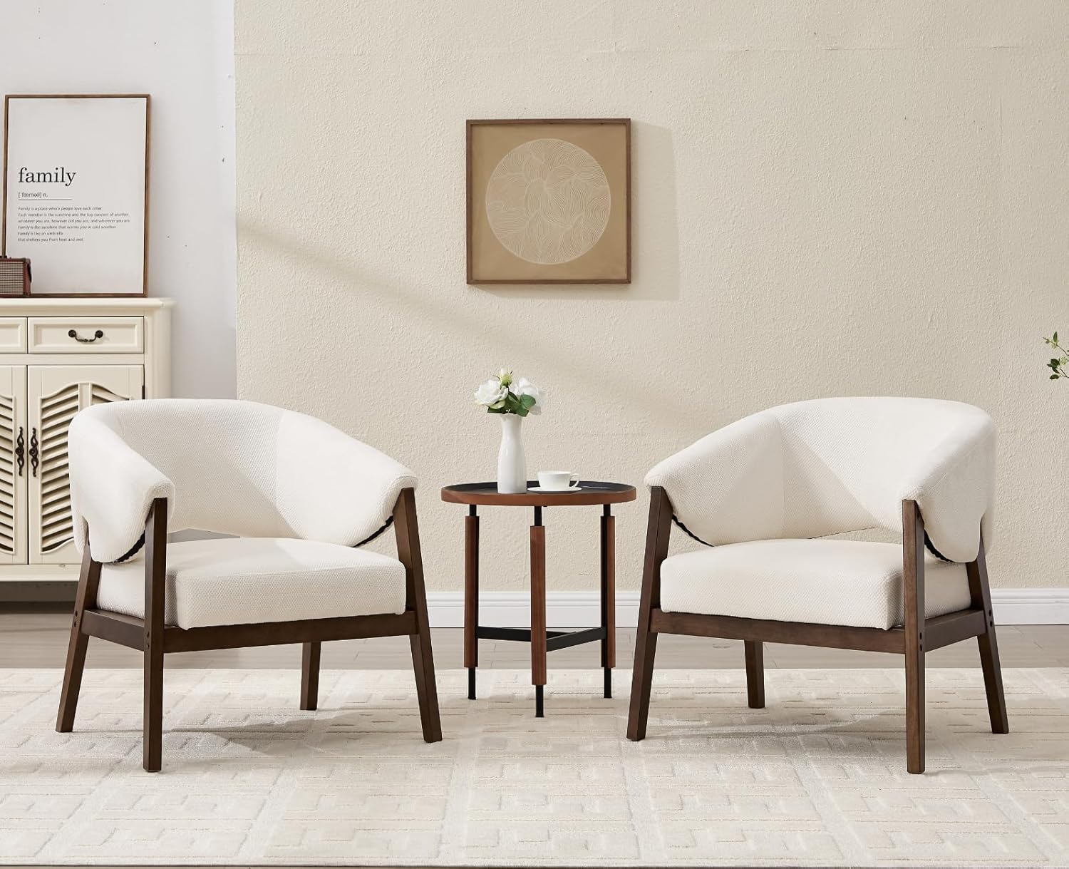 Mid-Century Modern Accent Chair, Comfy Barrel Armchair with Wide Seat, Upholstered Lounge Chair with Walnut Wood Legs for Living Room/Bedroom/Reading Corner, Chenille, Beige, 1PC