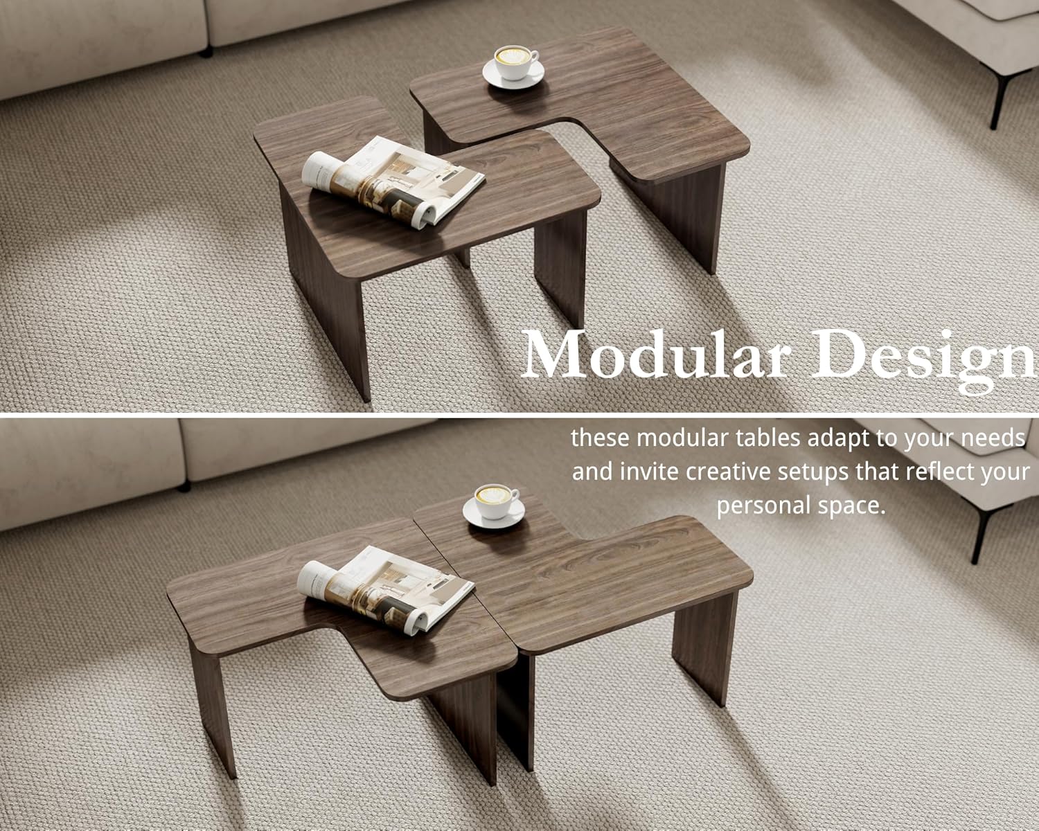 VESCASA Modern L Shaped Nesting Coffee Table Set of 2 Modular Rectangle Walnut Wood Table for Living Room