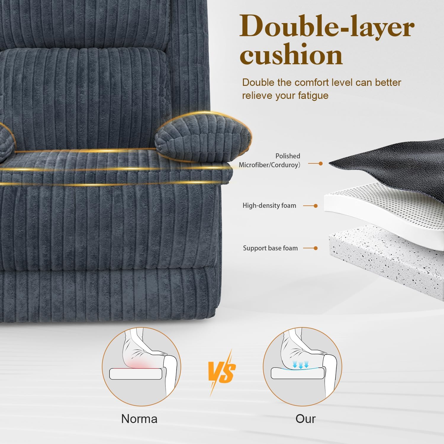 - Double-layer Seat Cushion: FURNIMAT recliner chair has a double-layer cushion on the seat. The additional 1.5-inch thick cushion not only makes the entire chair look more beautiful but also improves the sitting comfort a lot, and is less likely to collapse during use. Double-layer cushion, double comfort