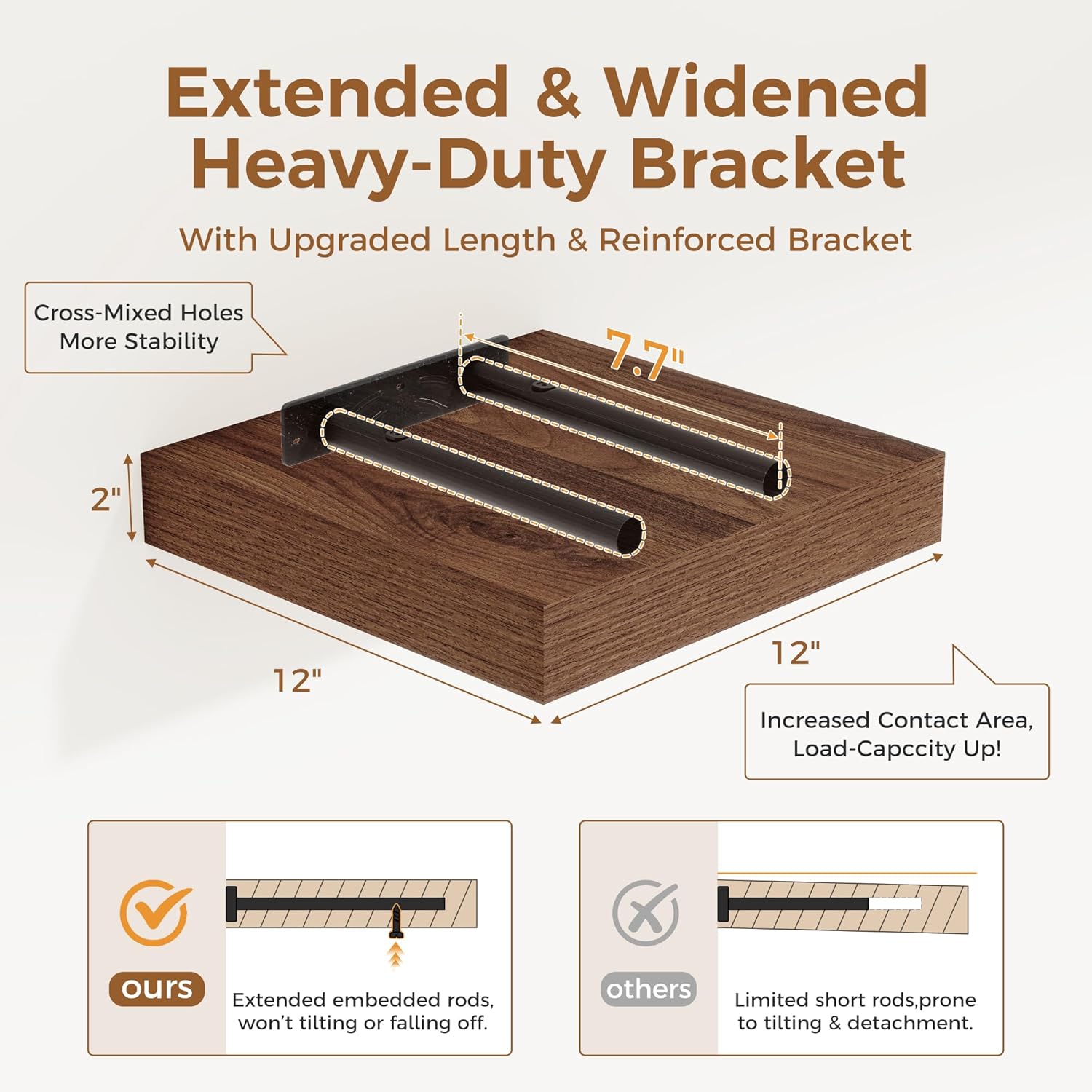 Fun Memories 12 Inch Floating Shelf, Rustic Wood Wall Shelves for Wall Decor & Storage, 12 x 12 Floating Shelf for Living Room, Bathroom, Bedroom, Walnut, Set of 2