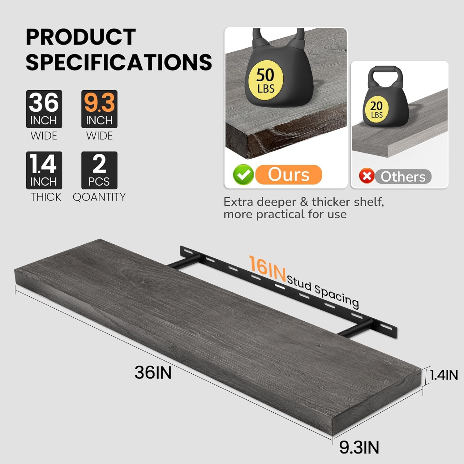 Fun Memories Floating Shelves for Wall, 36"x9.3" Rustic Solid Elm Wood Shelves, Heavy-Duty Wall Mounted Shelves with Invisible Brackets, Set of 2 for Living Room, Bedroom, Kitchen, Grey Finish
