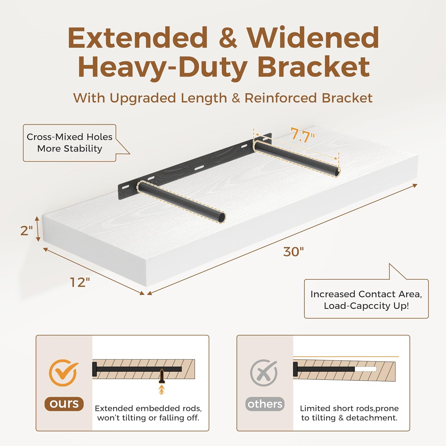 Fun Memories 30 Inch Floating Shelves White, 12 Inch Deep Floating Shelf for Books, 30 x 12 x 2 Deep & Thicked Wall Shelves for Bathroom, Living Room, Kitchen, Set of 1