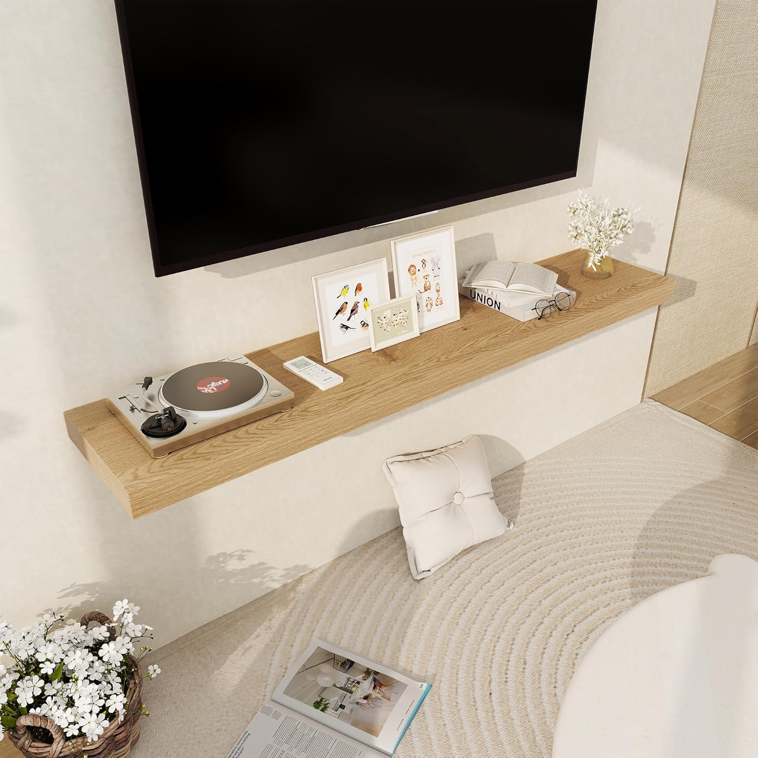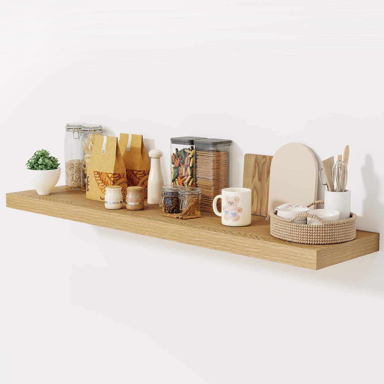 - ăDECORATIVE & FUNCTIONALăThe wall-mounted floating shelves are designed for decoration and storage, utilizing and decorating any space in your home. Used as shelf decor to show your collection, books, or prize, the hanging shelves are perfect for displaying your photo frame, small plants, model, or audio in your living room, office, study. And can also use as over the toilet storage shelf in the bathroom to hold toiletries or used as kitchen shelf to storage condiments.