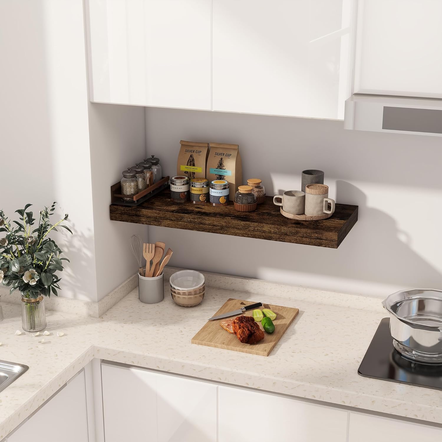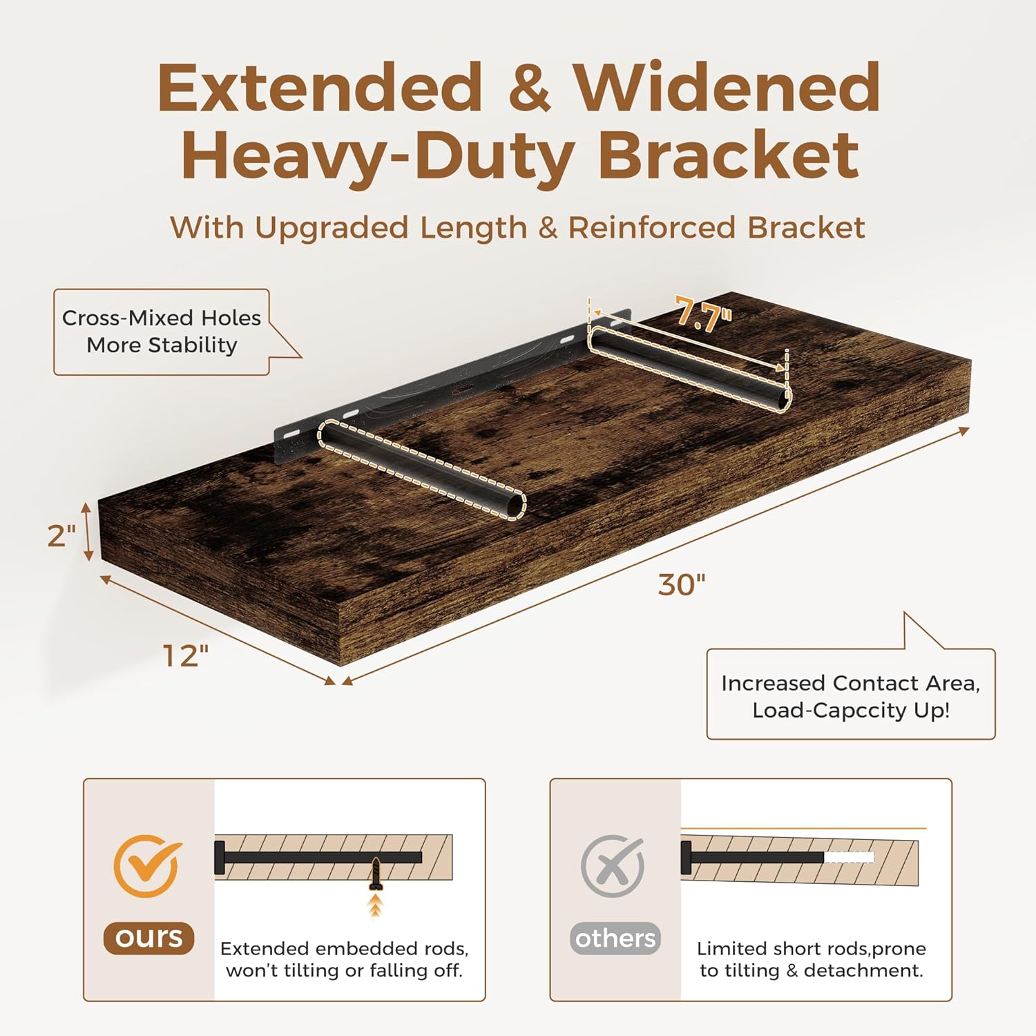 - ăFARMHOUSE RUSTIC WALL SHELFăThese floating shelves are made of premium engineered wood board and invisible one-piece bracket. The rustic wooden grain surface add character and warmth to any modern or traditional interior with these thick floating shelves, contrast shelves at staggering heights on the wall or mount side-by-side or in the corner for a clean streamlined look.