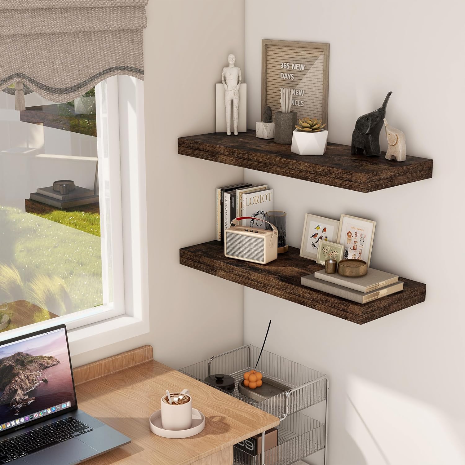- ăDECORATIVE & FUNCTIONALăThe wall-mounted floating shelves are designed for decoration and storage, utilizing and decorating any space in your home. Used as shelf decor to show your collection, books, or prize, the hanging shelves are perfect for displaying your photo frame, small plants, model, or audio in your living room, office, study. And can also use as over the toilet storage shelf in the bathroom to hold toiletries or used as kitchen shelf to storage condiments.