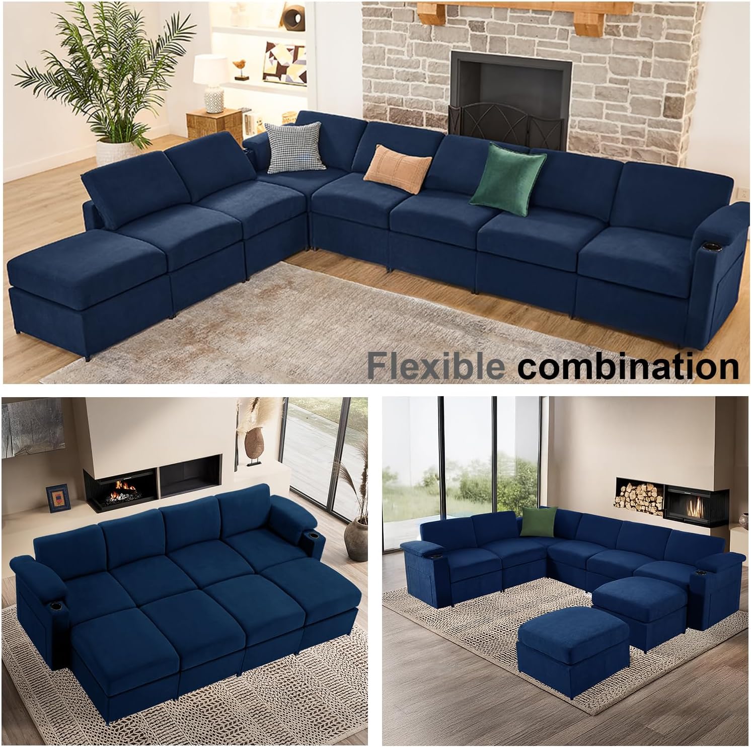Modular Sectional Sofa Couch for Living Room Velvet Cloud Couches Oversized U Shaped Convertible Sleeper Sofa Chaise Detachable Armrest Cushion Cup Holder (Blue, 8 Seats)