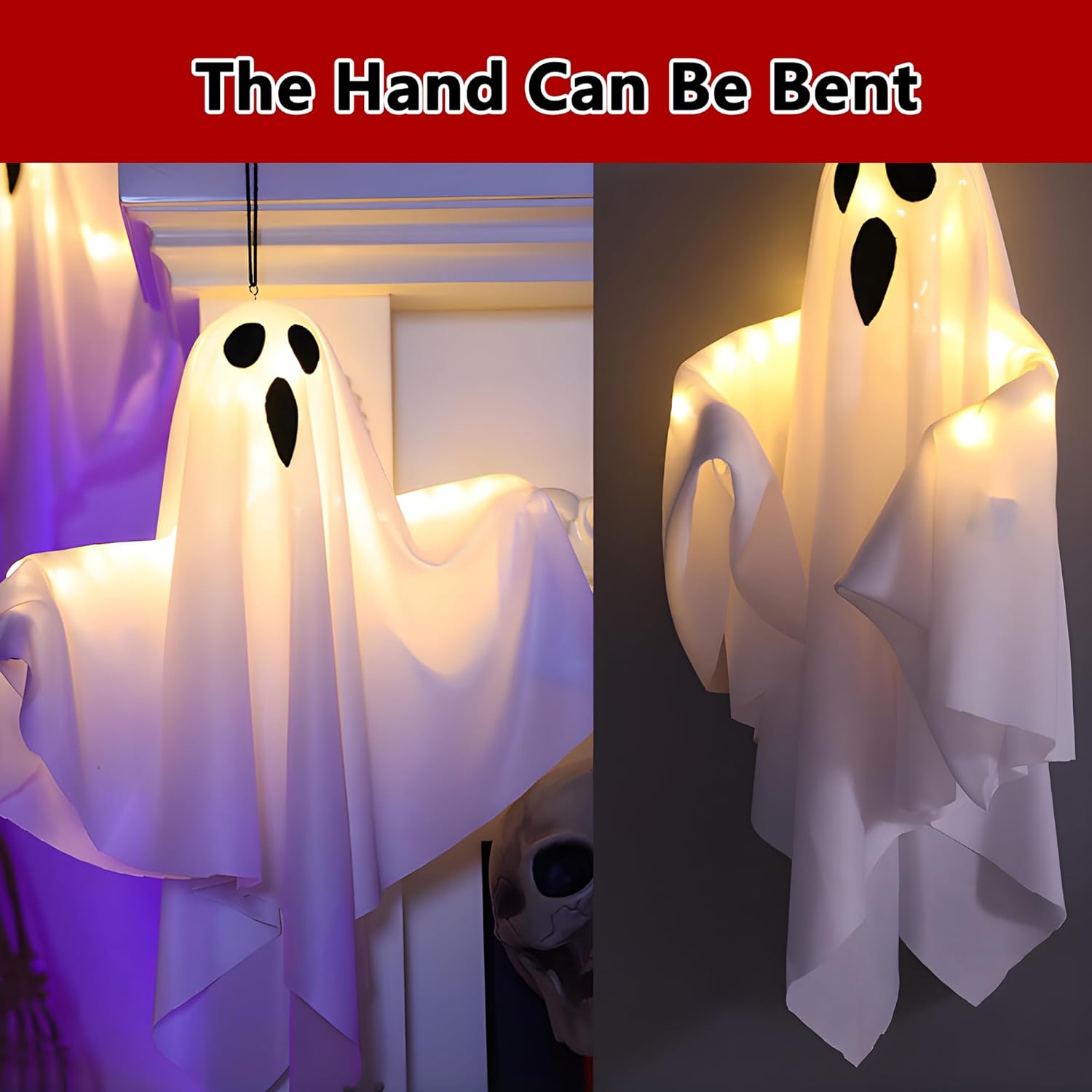 - 👻The 19.6-inch height adjustable ghost stands on indoor kitchens, offices, dining tables, fireplaces, and cabinets, or hangs on porches, surprising every visiting guest. The design can withstand outdoor conditions while maintaining its charming appearance throughout Halloween.