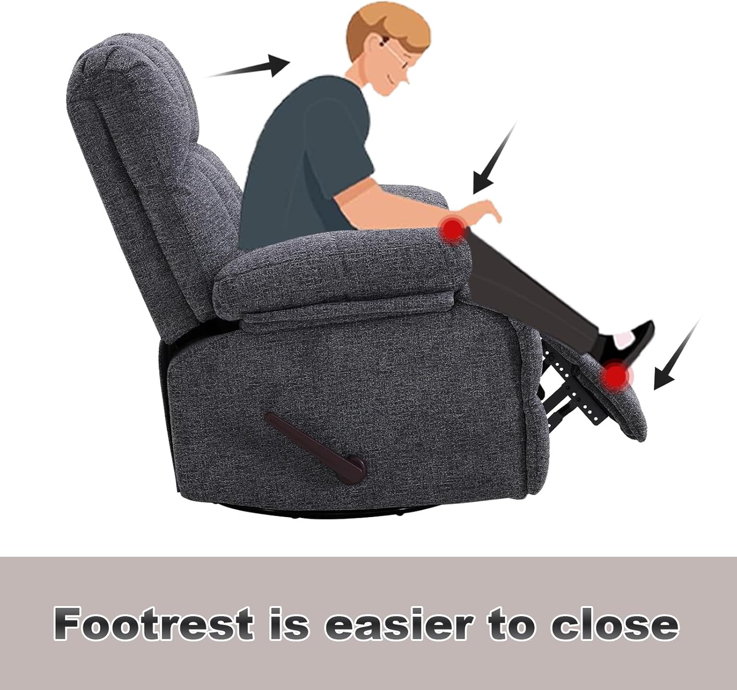 - ăFULL RANGE OF MOTION ăďźStay energized even when you're resting. Our rocking recliner offer a full 360-degree swivel and 30-degree rocking, allowing you to easily turn in any direction to help eliminate stress and fatigue.