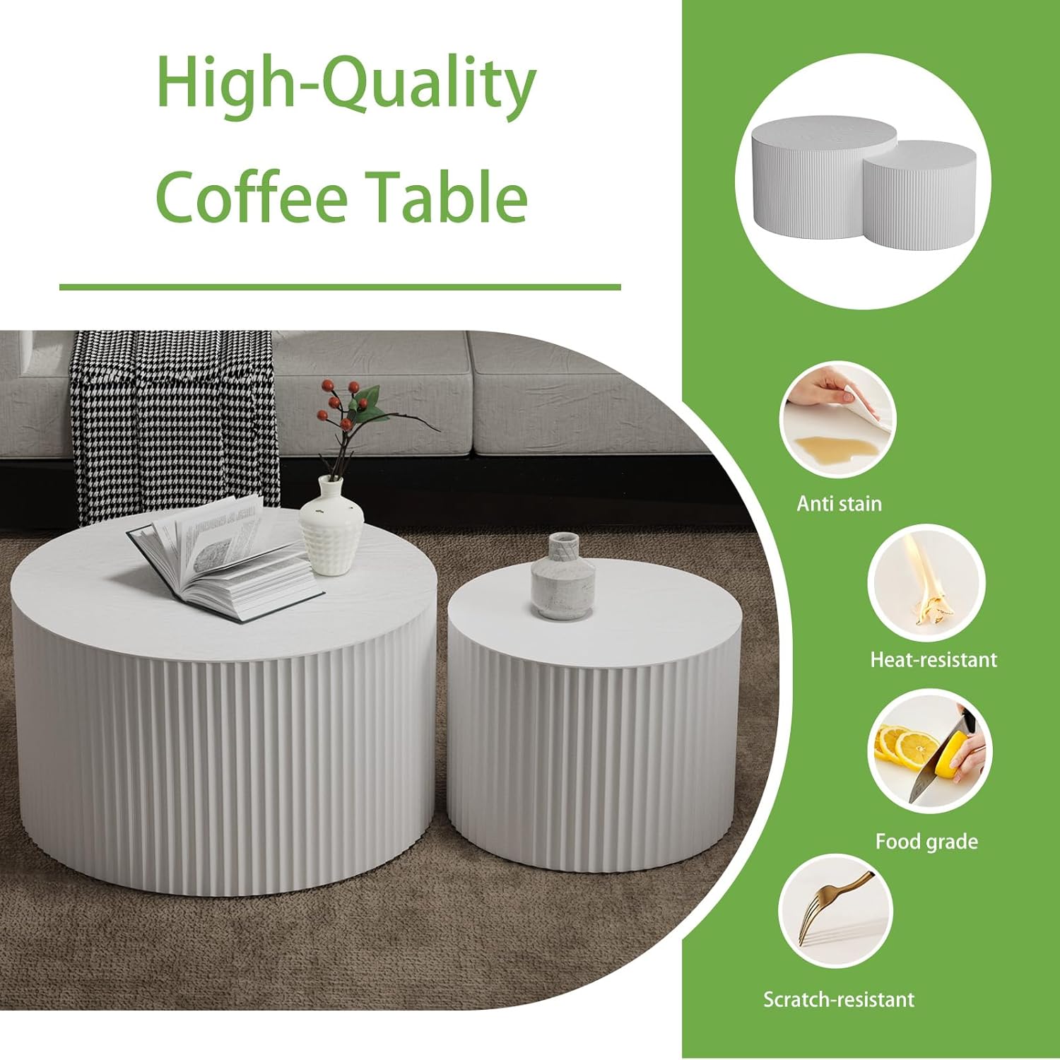 - Density Board Material: The round nesting coffee table is made from high-quality density board, ensuring excellent stability and load-bearing capacity, and the nesting coffee table circle is resistant to deformation. Moreover, the modern nesting coffee table is easy to clean and maintain with the smooth flat surface, providing a reliable experience whether placed in the living room or bedroom.