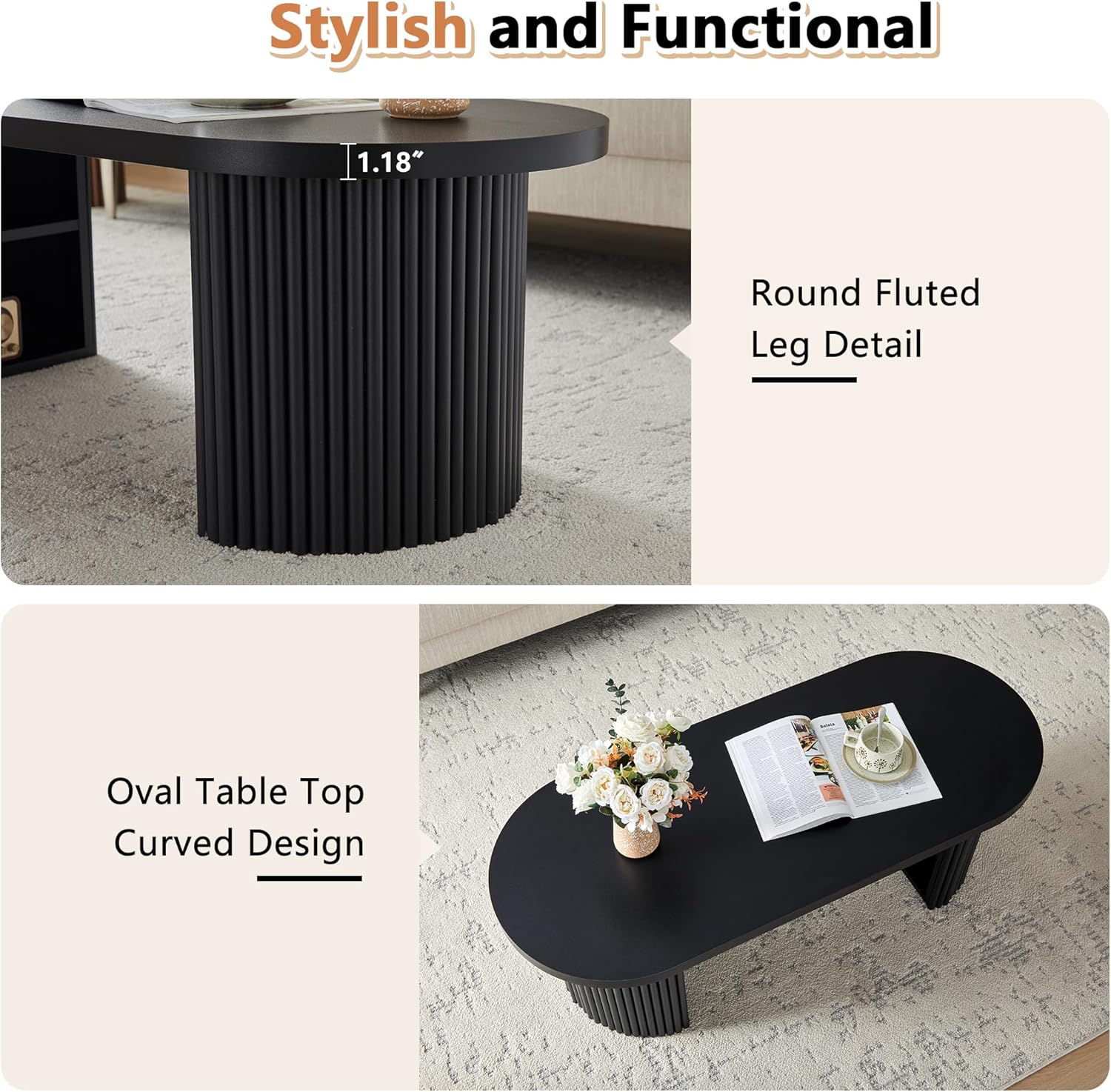 Oval Fluted Coffee Table, 47" Farmhouse Wood Coffee Table Mid Century Modern Center Table Boho Living Room Tables for Living Room Office,Black