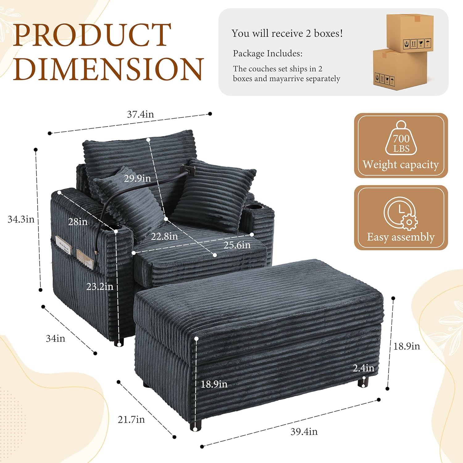 - Smart Storage Solutions ā Hidden Compartments in Armrestsļ¼ Keep your space clutter-free with discreet storage compartments under the armrests. Perfect for stashing remotes, books, or blankets, this feature enhances your chairs living room area by combining style with smart practicality.