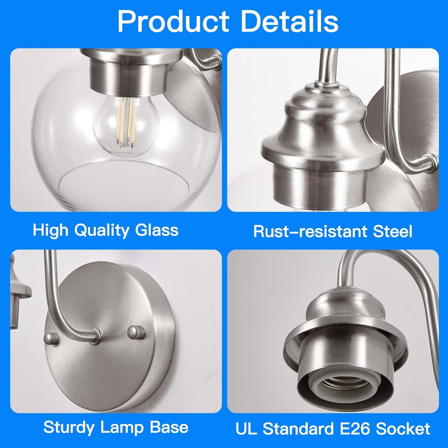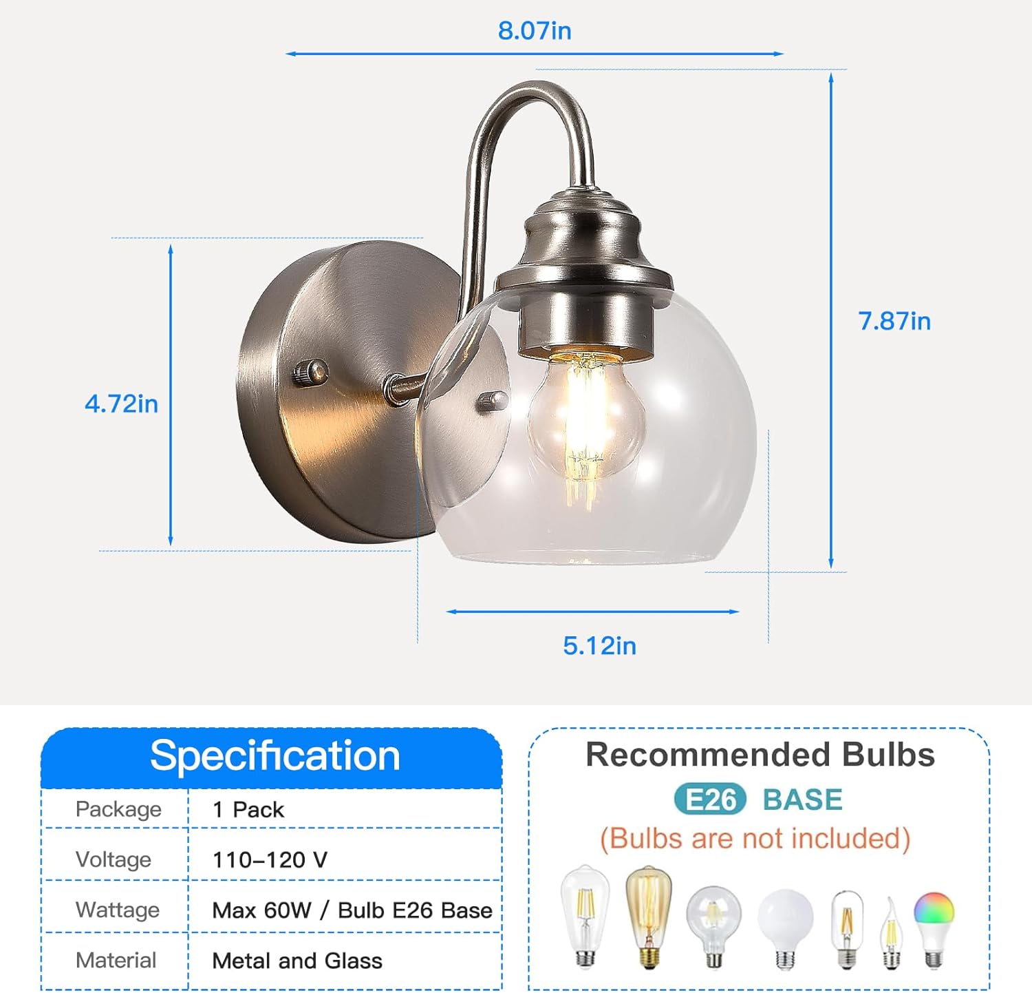 - ăStandard E26 Baseă: Our bath vanity light fixtures set require 2 x E26 medium base bulbs (Max 60W for each light, Bulbs not included). This wall lamp areCompatible with smart bulbs and dimming bulbs (without smart and dimming functions). 2700K warm white bulbs brings you relaxing and welcoming feeling, however 5000K daylight white bulb give you clean and energetic enjoyment (Max. 60W, Hardwire 120V)