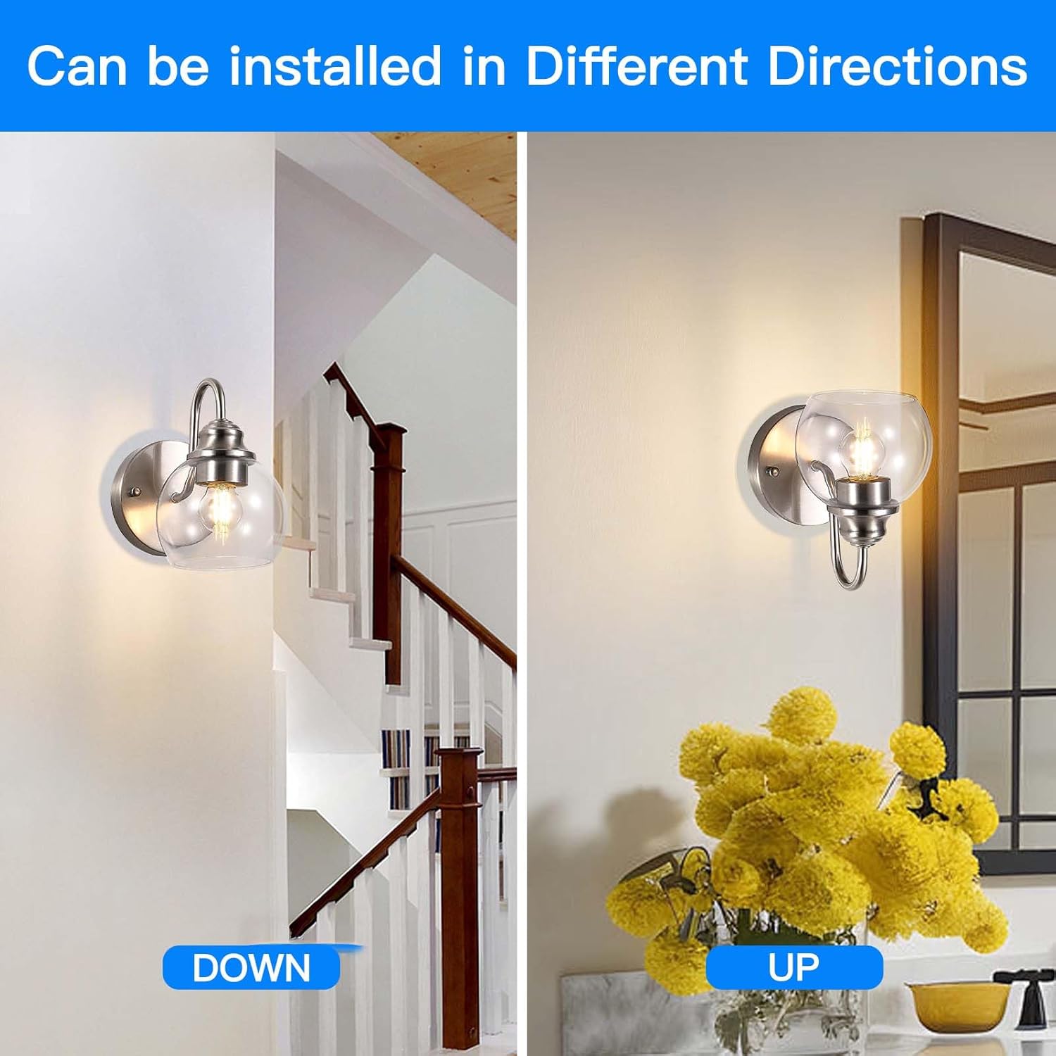 - ăLights Set Upward or Downwardă: These wall mounted light fixtures make it easy to install decorative up/down wall lights in many different areas you want, the modern wall light fixture can be installed downward as a bathroom vanity light or bedroom wall light, or installed upward as a fireplace light or dining room wall light, so this wall light can go into any style and will not look so obtrusive, instead it will add decoration to your space.