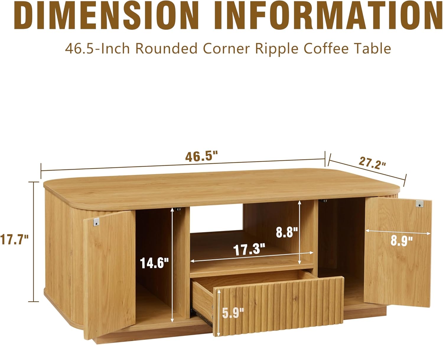 46.5" Oval Coffee Table with Drawers and Storage Mid Century Modern Fluted Solid Wood Side Coffee Tables, Luxury Tea Table Center Table for Living Rooms Offices Apartmen, Natural