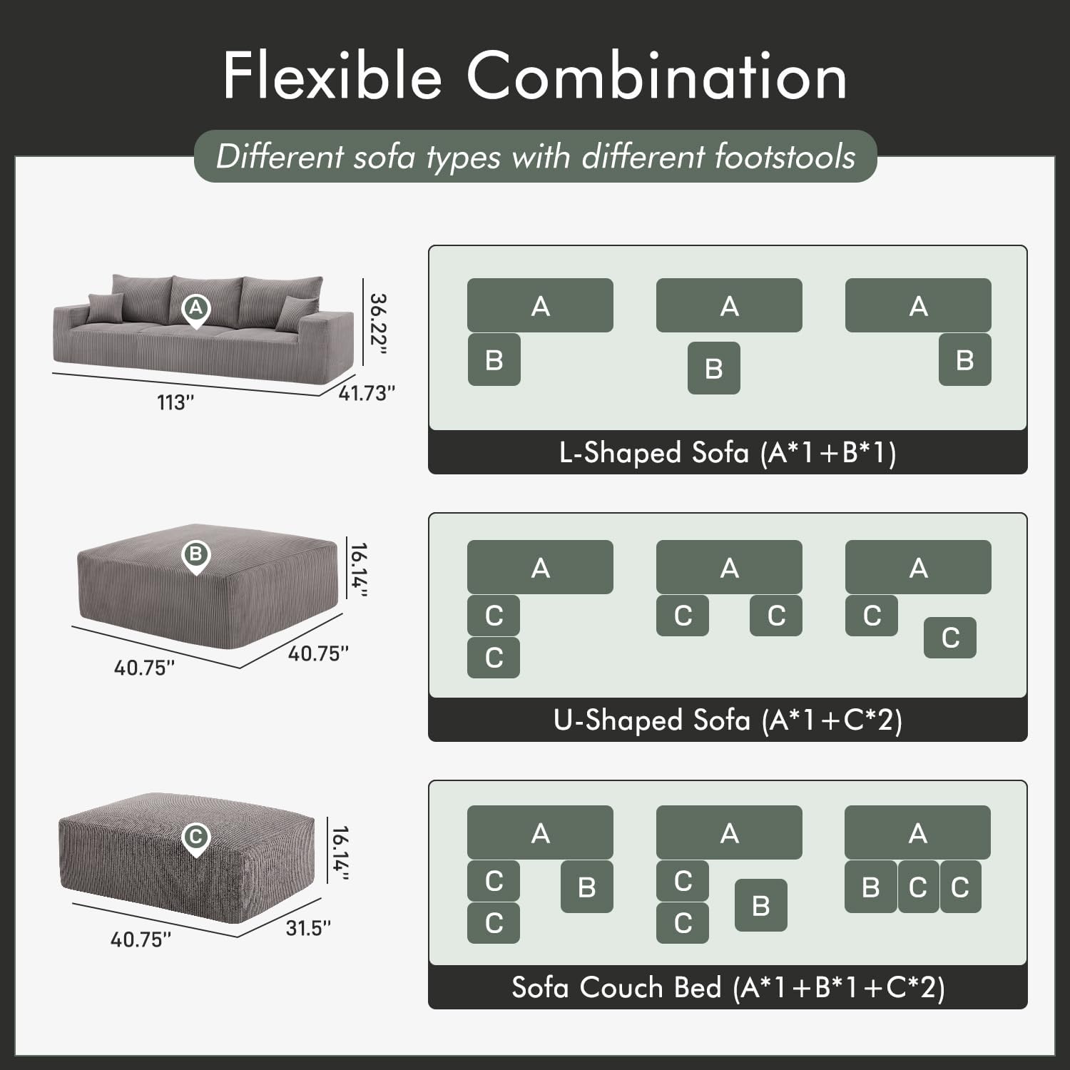 Boneless Sectional Cloud Couch Sofa for Living Room, 112" U-Shaped Modular Modern Lounge Sleeper Grey Couches with Chaise, No Assemble, Cordury Compression Upholstered Sofas