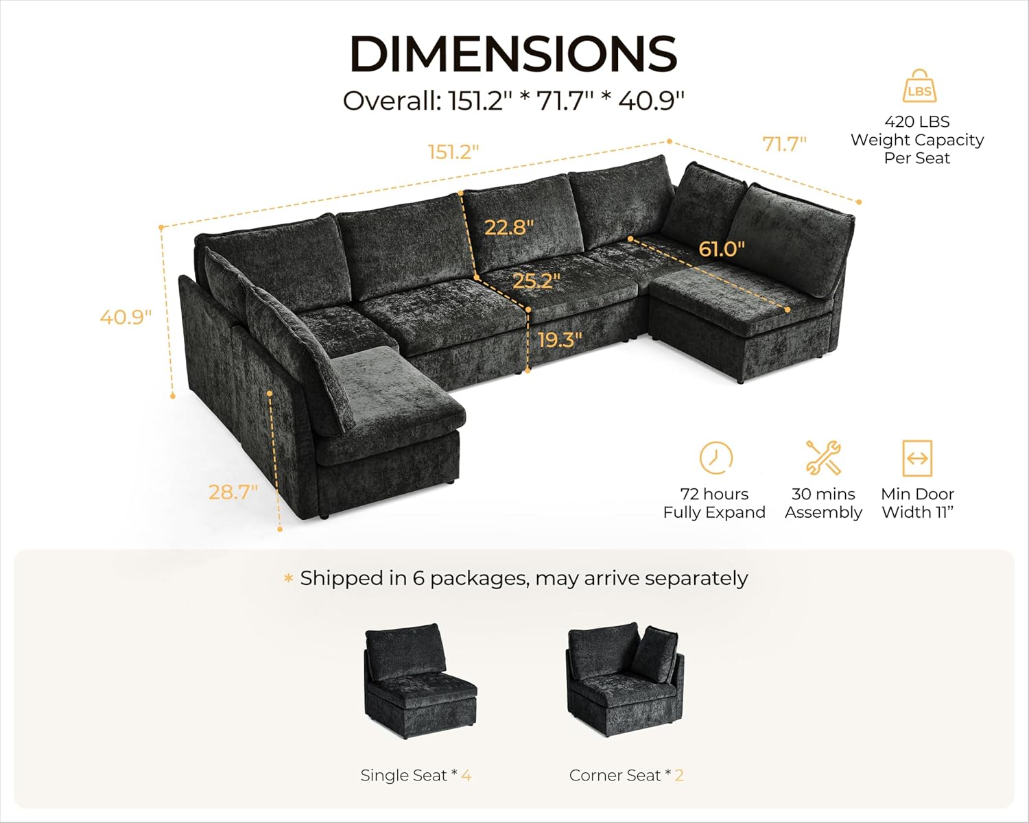 - ăMultiple Packages & Dedicated Supportă Your cloud modular sectional couch ships in 6 separate packages, which may arrive at different times. If you receive only some boxes, donât worryâmore are on the way! Need additional tracking details or assistance? Weâre happy to helpâjust reach out! Our team is here to ensure you receive everything as expected and guarantee a smooth, hassle-free shopping experience with your complete satisfaction