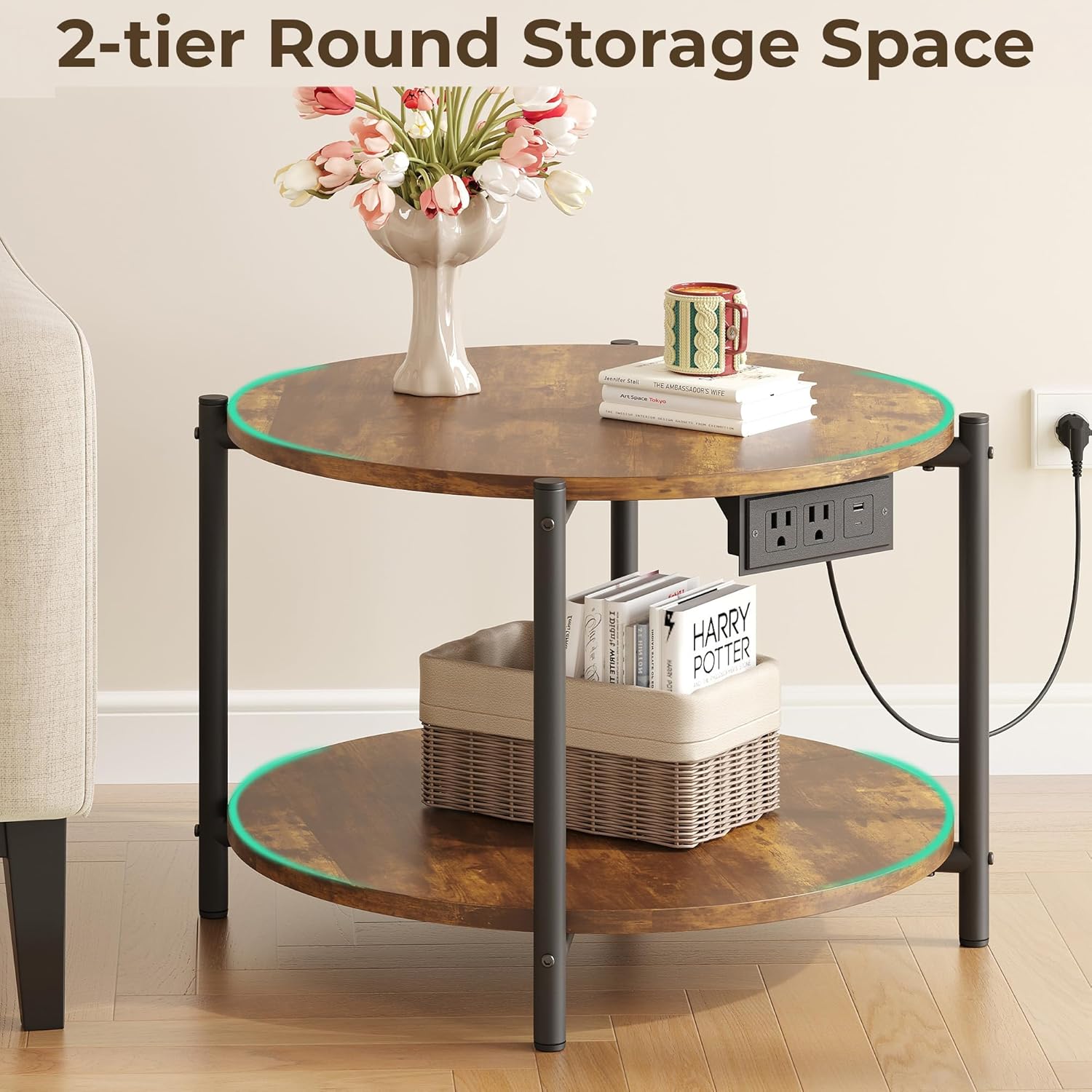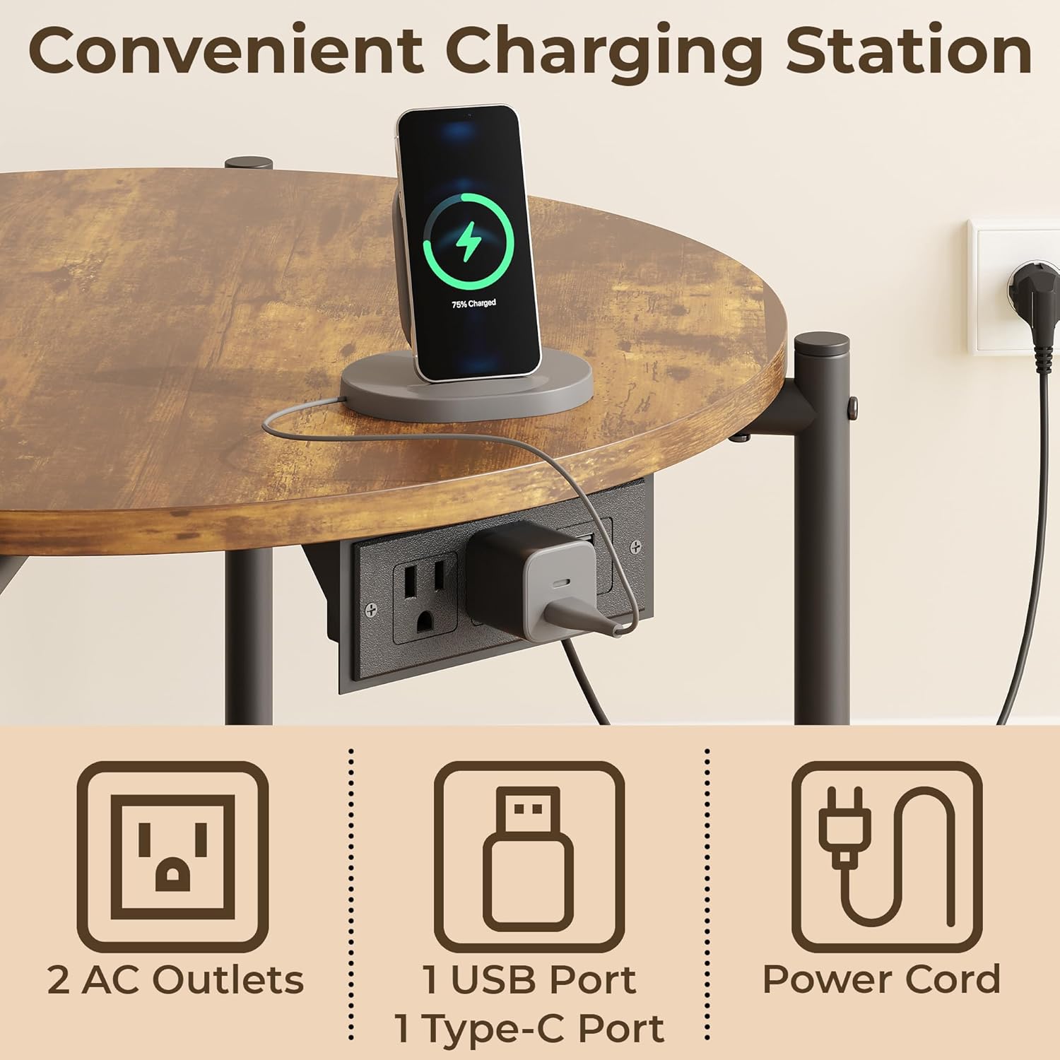 - ăRound Table with Charging StationăThese round side table set of 2 features 2 AC outlets, 1 USB port, and 1 Type-C port on the sides, allowing you to charge your phone, tablet, desk lamp, and other electronic devices directly on the tabletop without worrying about spilling coffee
