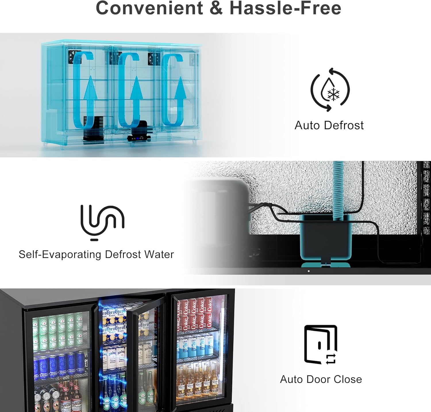 - 【Efficient Refrigeration】This 3 door commercial back bar cooler is equipped with a triple air-cooling power system, a 360° all-round air supply design, and an intelligent temperature control system to achieve automatic cooling cycle, truly achieving efficient and stable refrigeration.Supporting temperature adjustment of 32℉-50℉ to meet the refrigeration needs of various drinks;