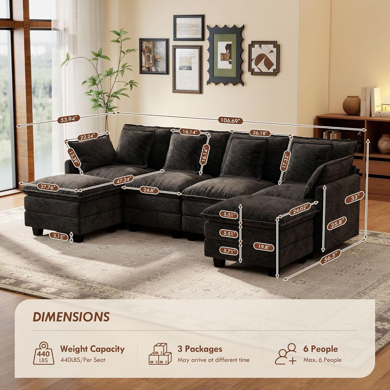 Ihanherry 106" L Shaped Modular Sectional Cloud Sofa, Modern 6 Seat Chenille Couch with Ottoman for Living Room, Bedroom and Apartment, Black