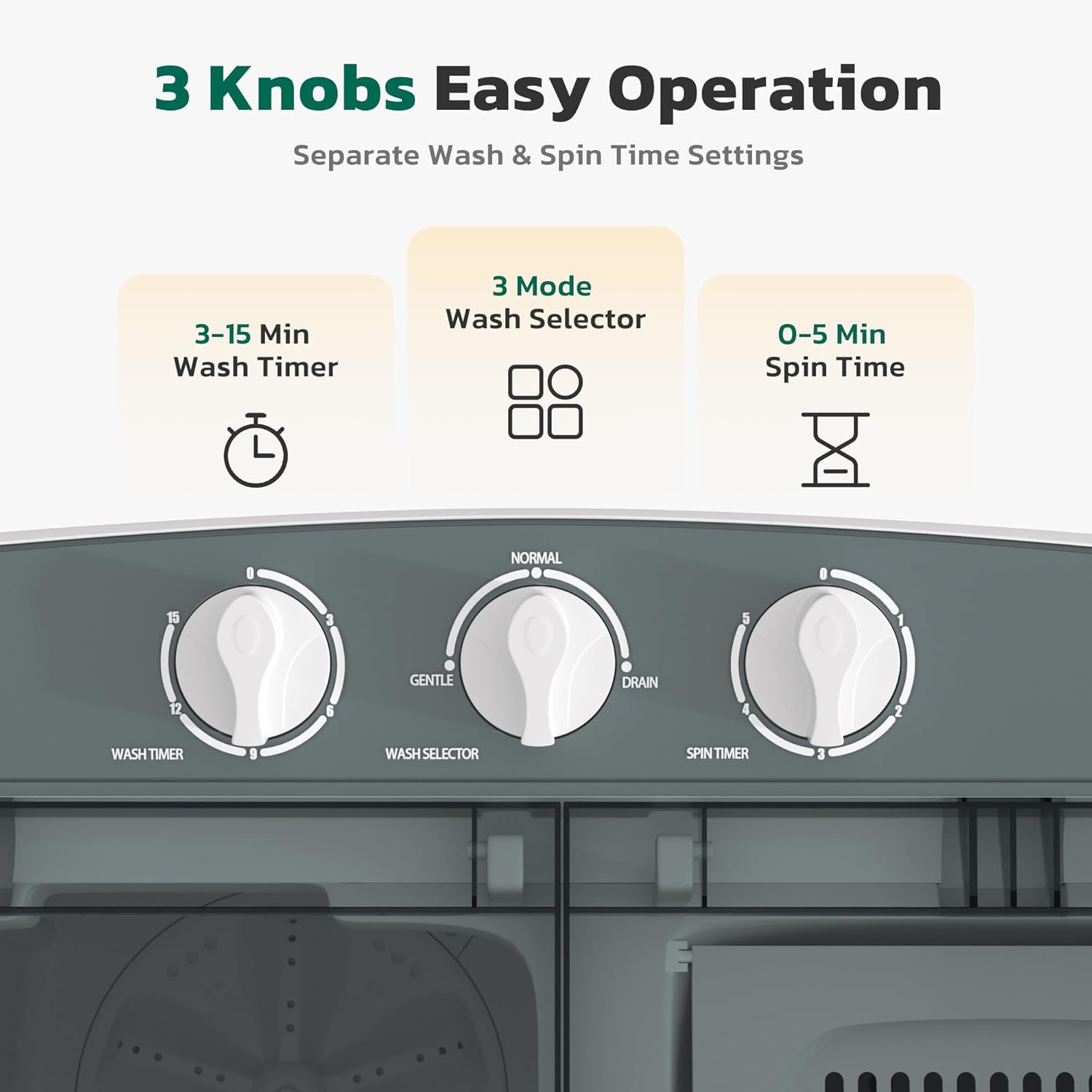 - [Easy to Operate]: Greenvelly portable washer dryer combo has three independent controls: wash timing (0-15 minutes), mode (gentle/standard/drain), and dehydration timing (0-5 minutes), which quickly completes washing and saves you valuable time.