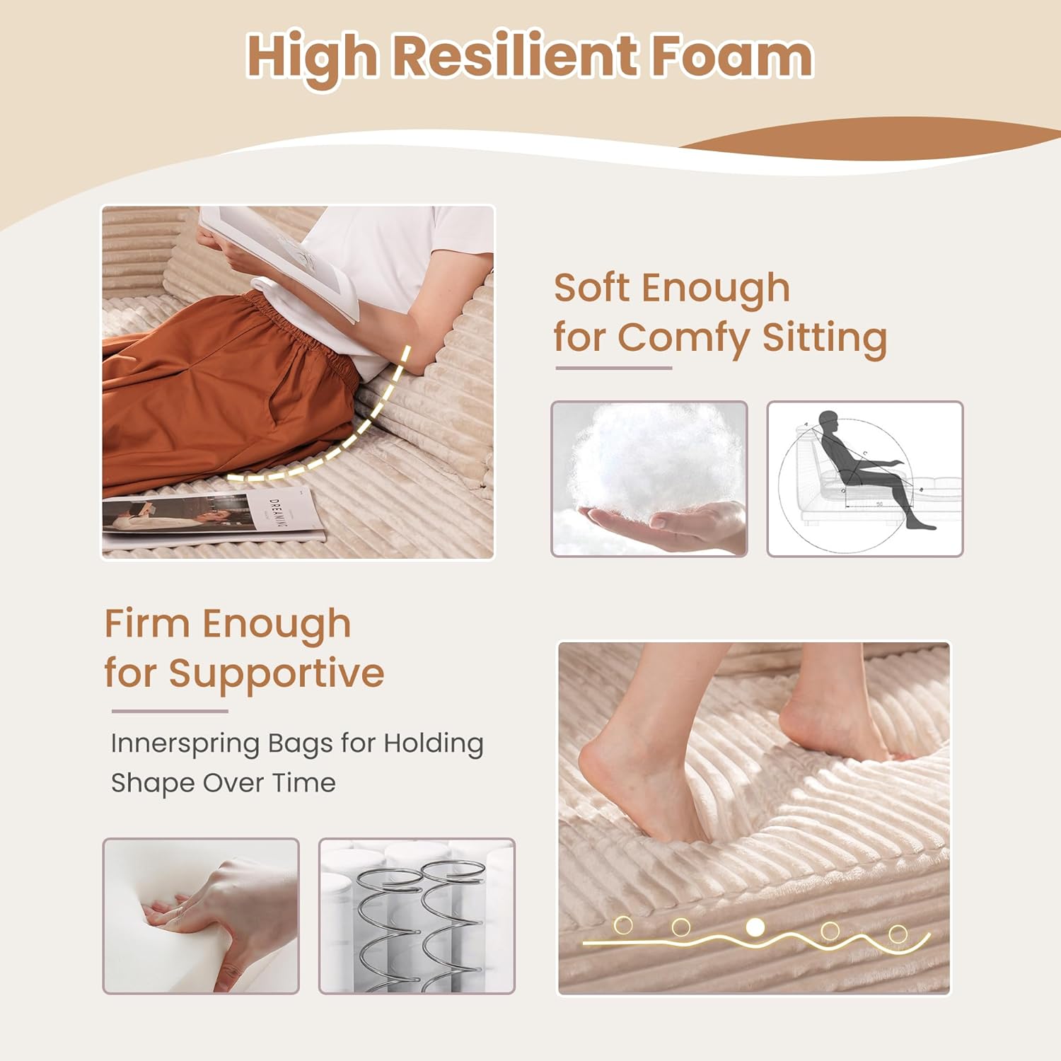 - Cloud Soft Foam: selected one-piece 16.5" extra thick ultra solft high resilient memory foam for great comfy seating, while with supportive inner spring bags inside to keep your posture and keep the couch itself in shape overtime