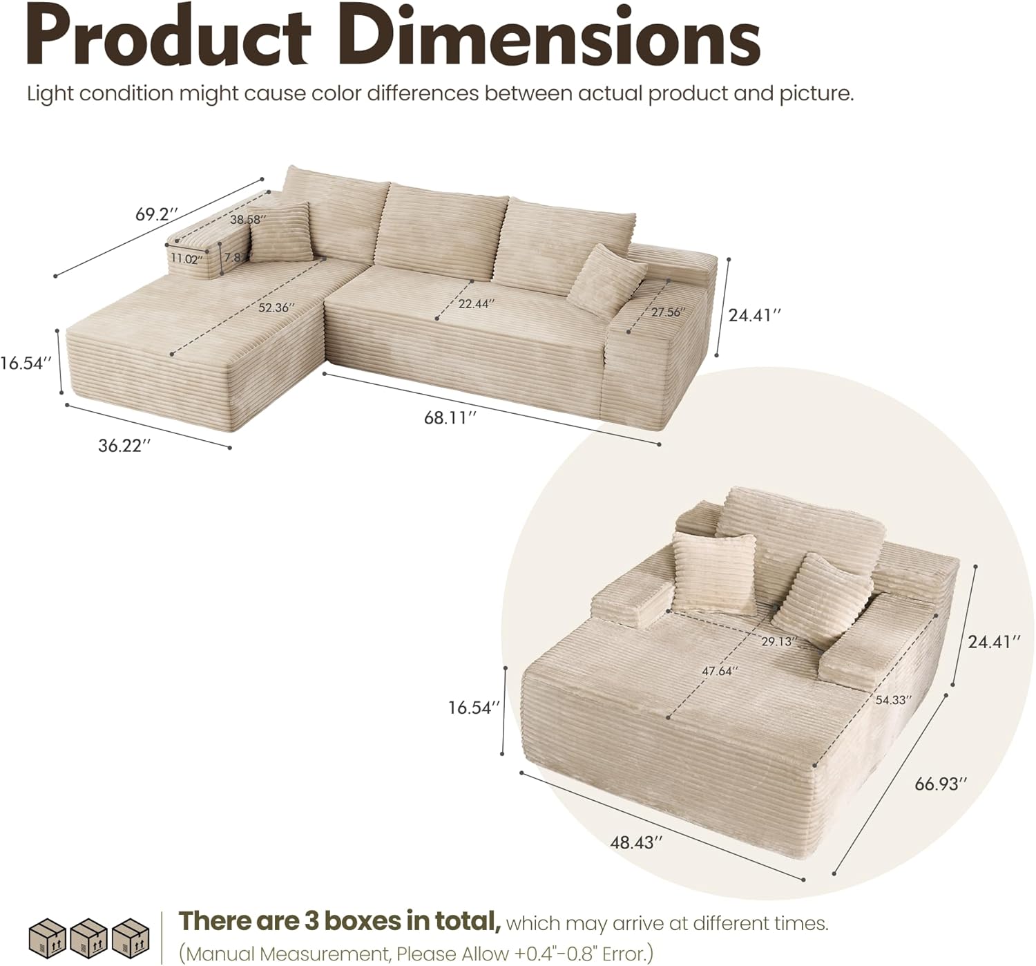 HOOOWOOO Cloud Sectional Couches for Living Room,Modular Sectional Sofa No Assembly,Plush Corduroy Large Floor Couch Furniture Set with Deep Seat Left L Shape and Chaise Lounge(Beige)