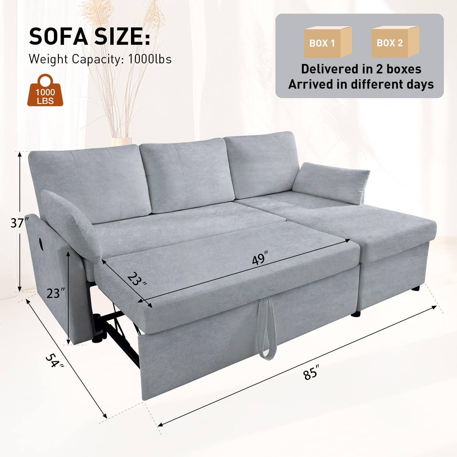 Waxberry Sectional Sofa Couch, Pull Out Couch Sleeper Sofa Bed with Storage for Living Room, Reversible Chaise, Side Pockets & Dual USB/Type-C Ports, Includes 1 Blanket, Grey