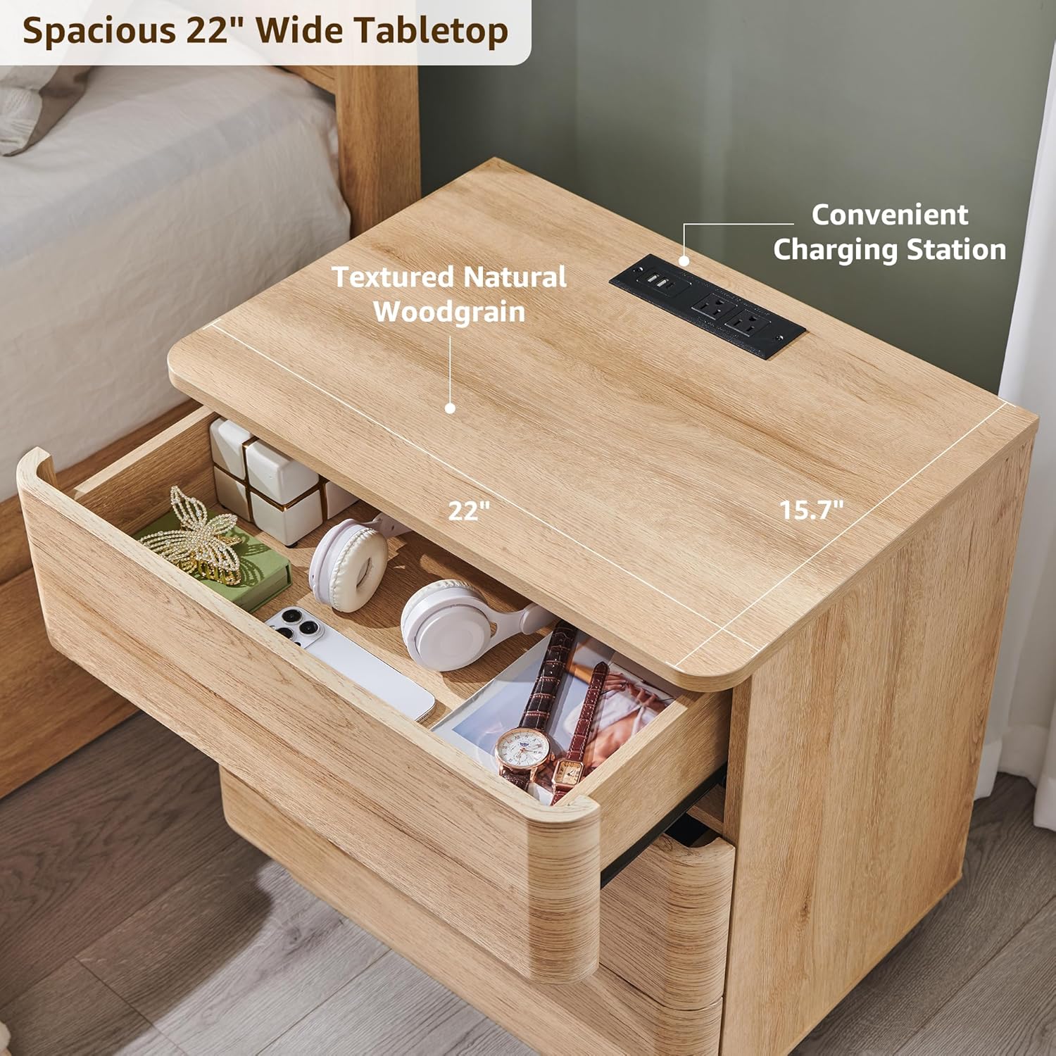- Built-In Charging Station â Power at Your Fingertips: Stay connected day or night with 2 AC outlets, 2 USB ports, and 1 Type-C port built right into the tabletop (22"W Ă 15.7"D Ă 24"H). Conveniently charge your phone, tablet, lamp, or other devices while keeping cords organized and your nightstand surface neat